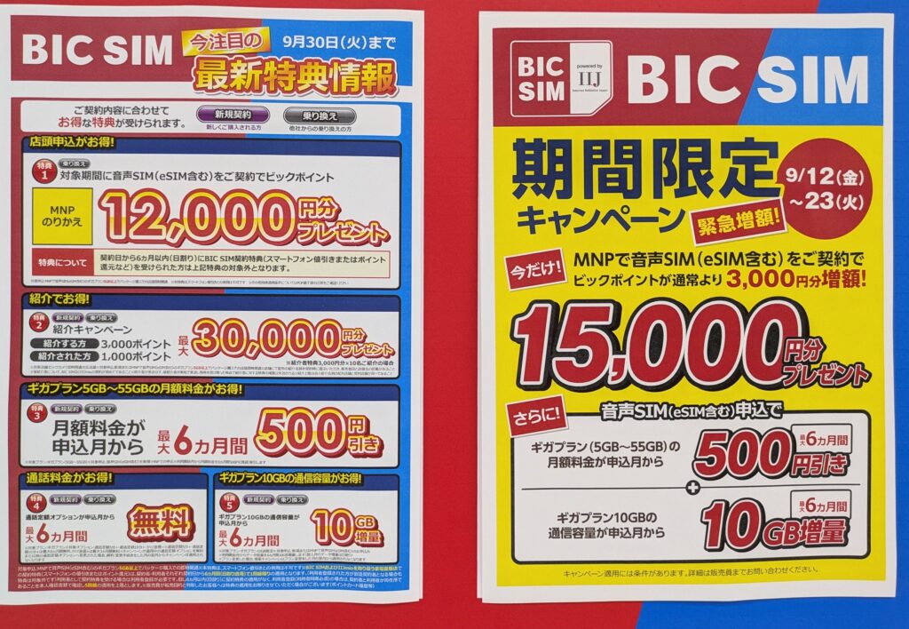 ビックカメラなんば店では、IIJmioへのSIMのみMNPで15,000ポイント還元となっています。事務手数料は3,280円(税込)、9/23(火)まで。引き続き6ヵ月条件はあります。