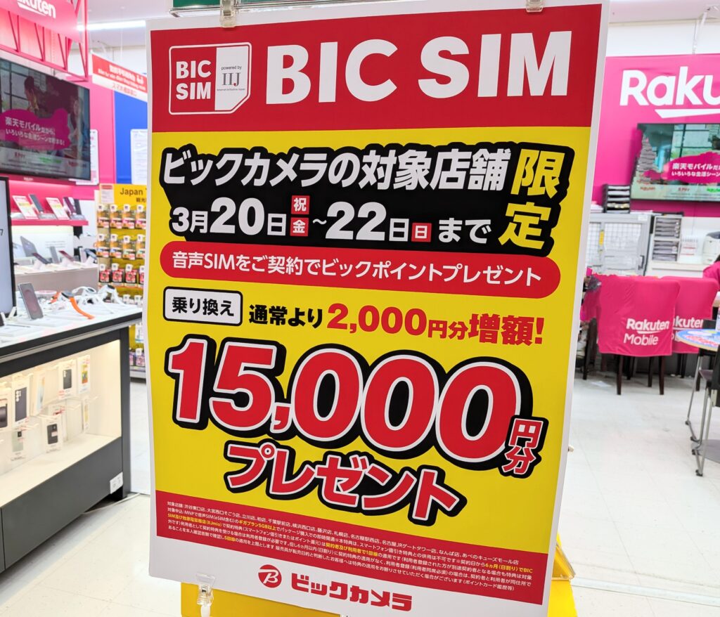 ビックカメラでは、IIJmioことBIC SIMへのSIMのみMNPで15,000ポイント還元となっています。事務手数料は3,280円(税込)、3/22(日)まで。6ヵ月条件はあります。