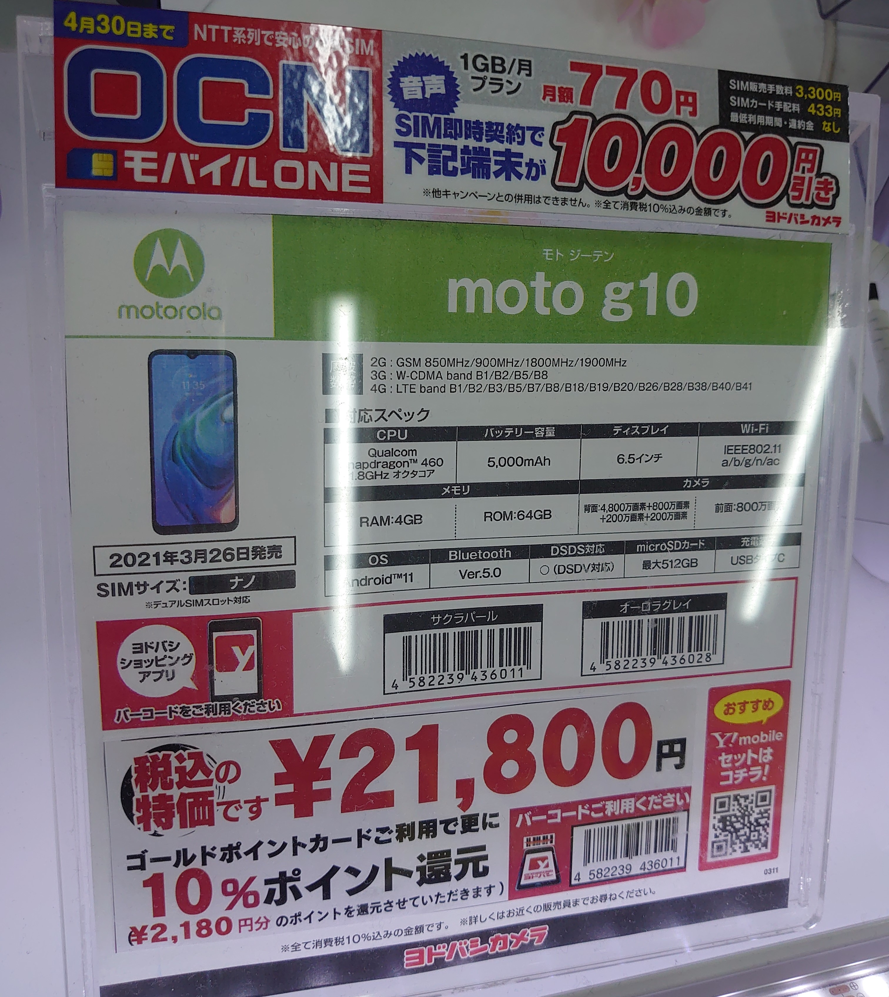 また、ヨドバシカメラ梅田ではOCNモバイルONEで10,000円割引(事務手数料は別途3,300円)、BIGLOBEモバイルで11,000円割引(事務手数料1円)です。SIMカード手配料・準備料はどちらも433円です。