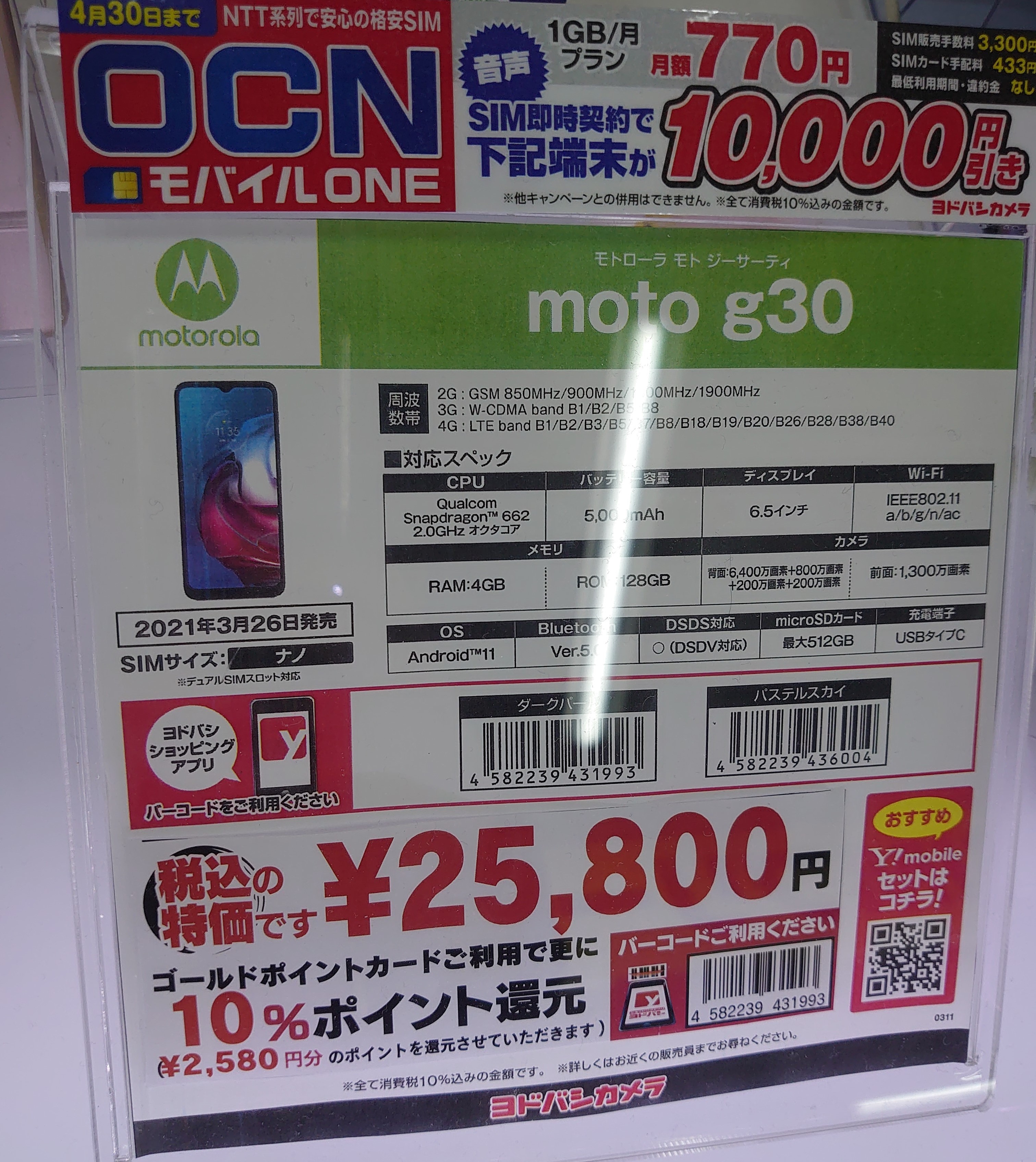 BIGLOBEモバイルの端末セットにモトローラ「moto g30」が追加されました。税込価格25,660円で、20,000円相当ポイント還元です。iPhone SE(第2世代)等もお得に購入出来ますので、下記ご参照下さい。月額料金も、3GBが770円/月(税込)で利用出来ます(1年間)。