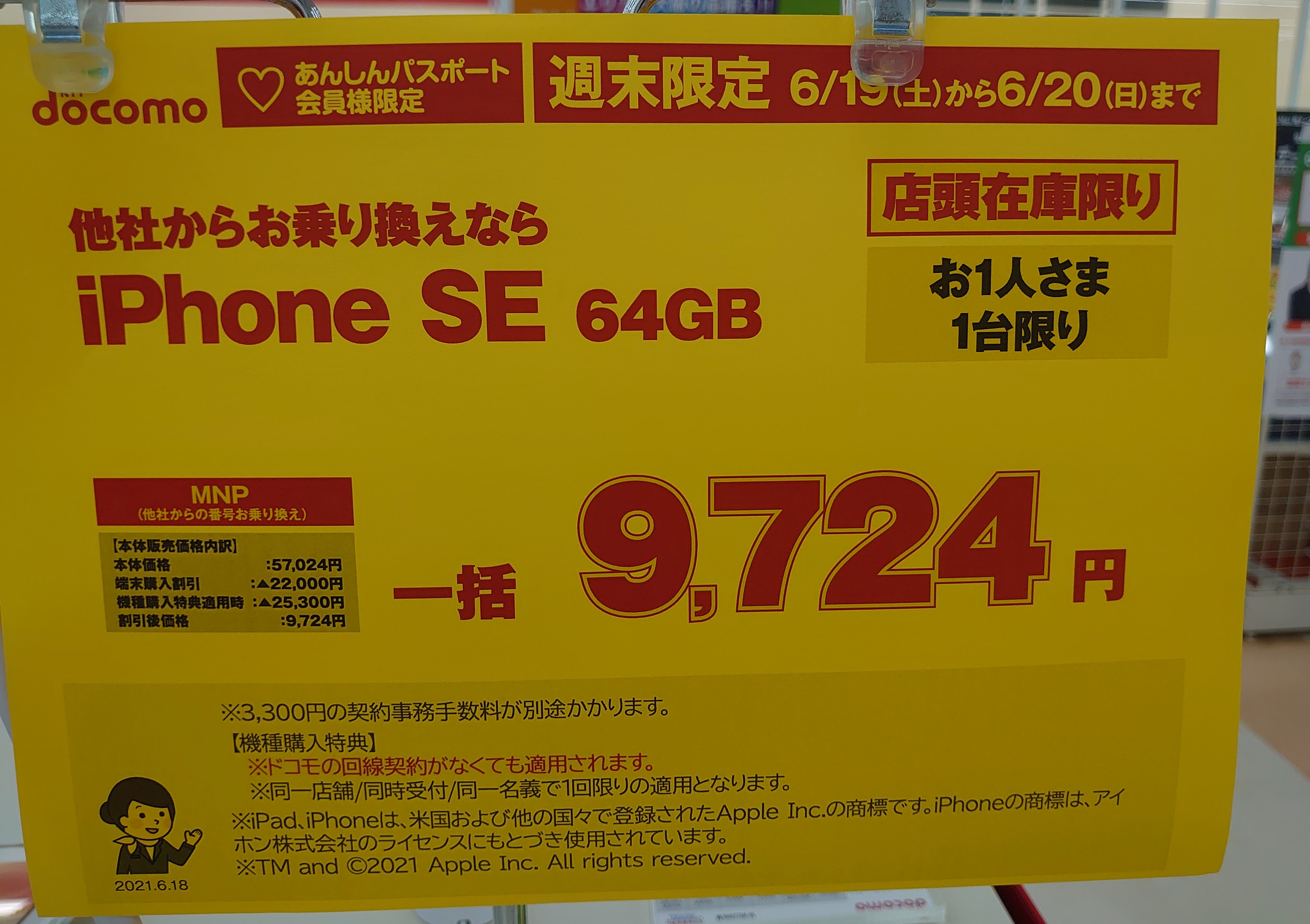 6/19(土)、6/20(日)の2日間はドコモのiPhone SE 64GB(税込57,024円)が、MNPで一括9,724円(税込)となっています。上記はケーズデンキですが、おそらくヤマダ電機など各量販店でも実施されている施策かと思われます。