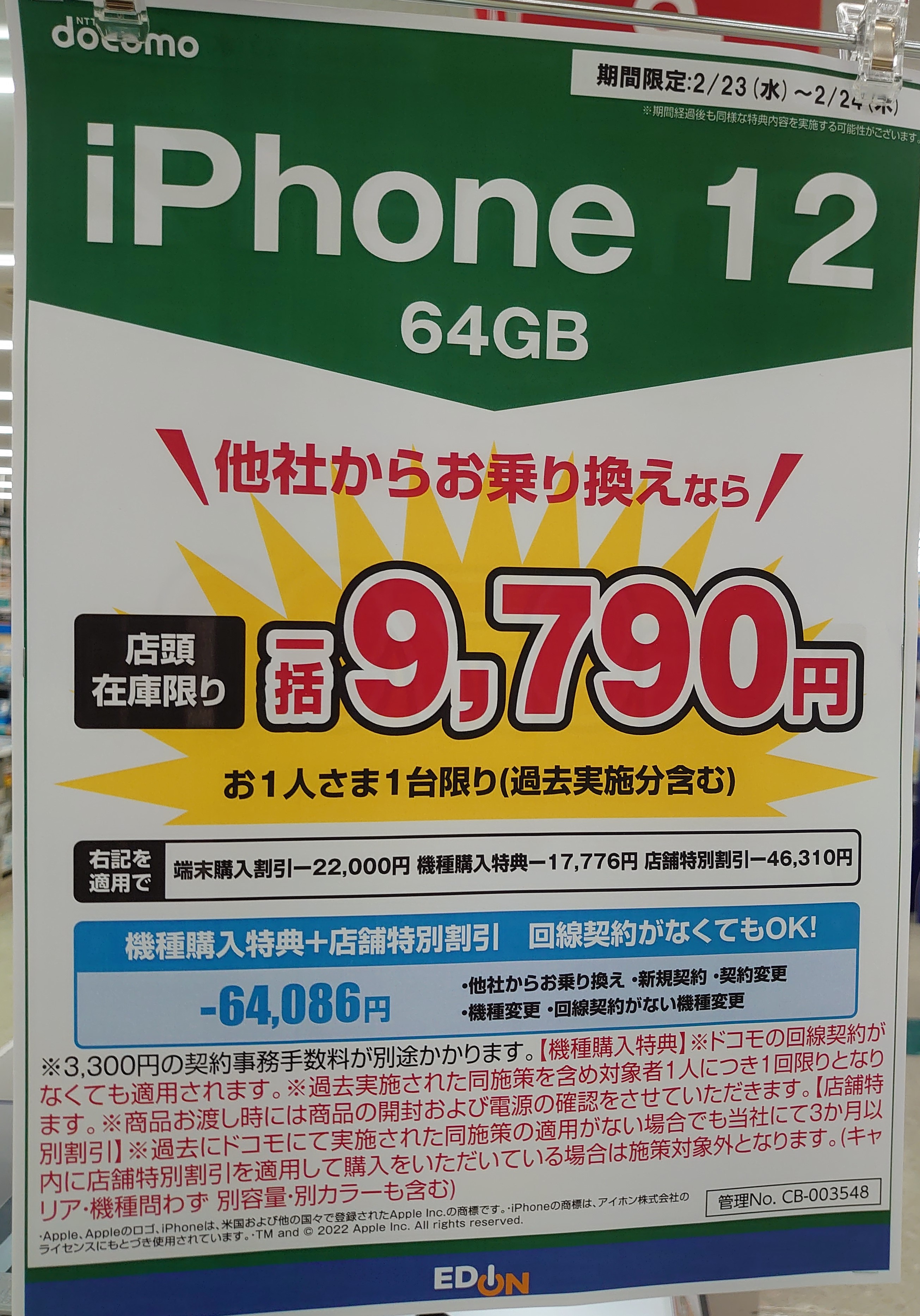 【2/23,2/24】ドコモ iPhone 12 64GBがMNP一括9,790円/エディオン 2022 2/23 ドコモ 2022年2月23日 当ページにはアフィリエイト広告が含まれています。 一応週末までのキャンペーンとのことですが、円町店は在庫なし、入荷予定なし、とのことです。 ドコモ よかったらシェアしてね! URLをコピーしました! URLをコピーしました! この記事を書いた人 Sakura R5G ケータイ特価情報をお届けします。 遠慮なくコメント頂ければ結構ですが、コメントは私が承認するまで表示されませんので、ご注意下さい。 ※2024年7月1日より、参考程度の投稿以外はX(旧ツイッター)に投稿しようと思っています。 人気記事 ワイモバイル 【8/14(木)より】価格(再)更新、ワイモバイル「Google Pixel 8a」が機種変更で49,536円にPayPay還元/事務手数料0円/ヤフーショッピング店 2025年8月14日 ワイモバイル 【2025/11版】ワイモバイル「iPhone 13(認定中古品)」が機種変更一括29,520円/事務手数料3,850円/オンラインストア 2025年11月9日 楽天モバイル 【2025/12版】楽天モバイル「nubia S2R」や「Galaxy A25 5G」がMNP一括1円/事務手数料0円 2025年12月2日 ドコモ 【2025/8版】ahamoへのSIMのみMNPで20,000dポイント(分割進呈)/事務手数料0円/NTTドコモ 2025年8月10日 楽天モバイル 【7/1(火)より】楽天モバイルへのMNPで▲22,000円割引/「Nothing Phone (3a)」が一括32,890円など/事務手数料0円 2025年7月1日 新着記事 【1/10(土)】 Joshin webで「Xiaomi 14T Pro 512GB(パッケージ不良)」が79,800円 【1/15(木)発売】楽天モバイル「Nothing Phone (3a) Lite」が32,890円/はじめて申し込み&MNPで16,000ポイント/2回線目以降は新規で6,000ポイント 【1/13(火)まで】UQモバイル「自宅セット割」適用で10,000ポイント追加還元/ビックカメラ コメント コメント一覧 (4件) 今ドコモでガラケー使っているのですが、ドコモのiPhone 12を買うとき、この場合は機種変更扱いなのでしょうか? それとも一括1万円以下で買えるのでしょうか? 返信 プラス22,000円で機種変更(契約変更)です。 返信 昨年みたいにガラケーからのmnpでiPhone12 pro一括0円出ませんかねー。 返信 そういえばこの時期でしたっけ。 返信 コメントする コメントをキャンセルコメント ※ 名前 メール サイト 新しいコメントをメールで通知 新しい投稿をメールで受け取る