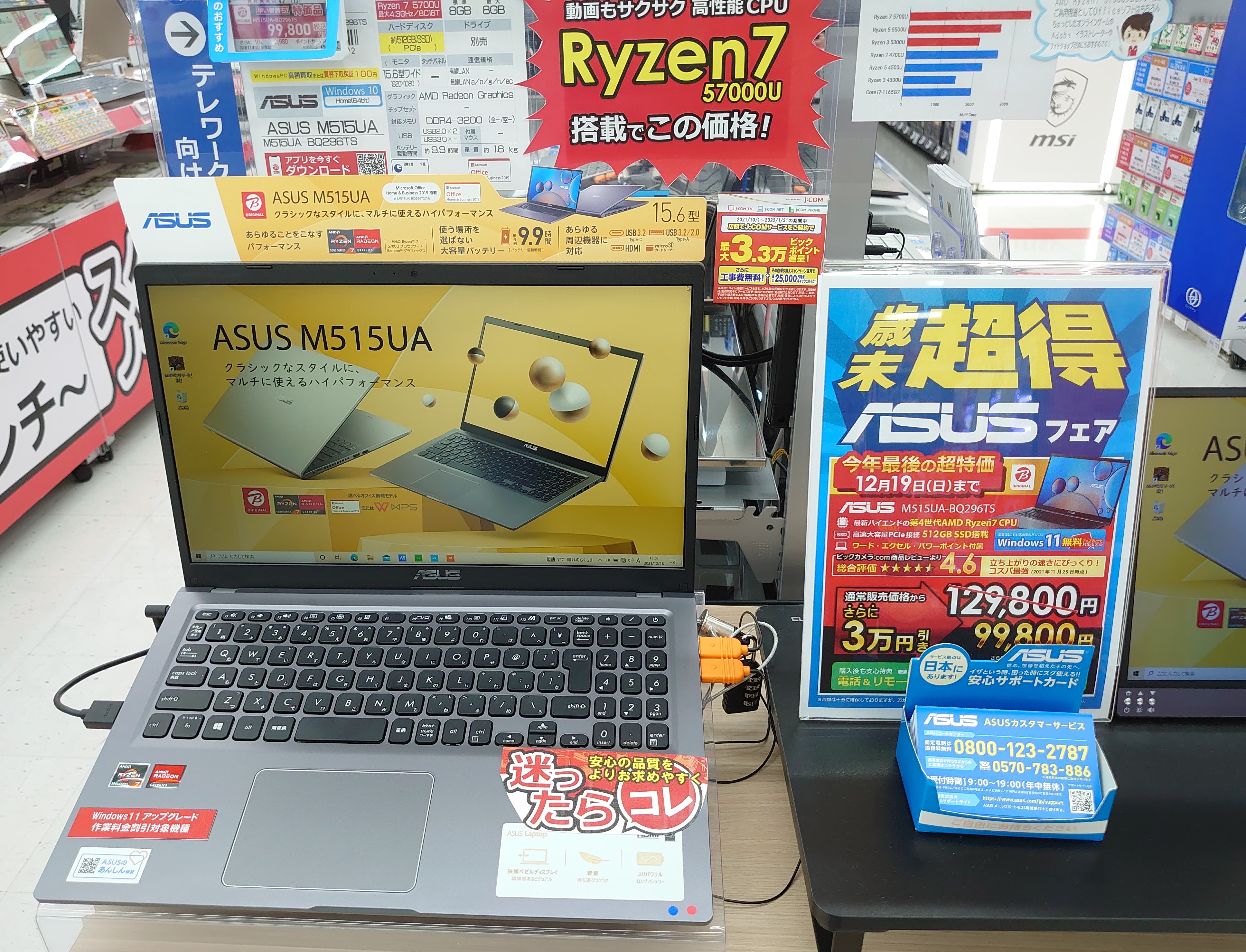 ※上記のASUS「M515UA-BQ296TS」ですが、ソフマップPayPayモール店では、日曜日10%OFFクーポン適用で95,800円(税込)で、さらに誰でも19,000円程度のPayPayボーナス還元が可能となっています。ワード、エクセルも付いてます。