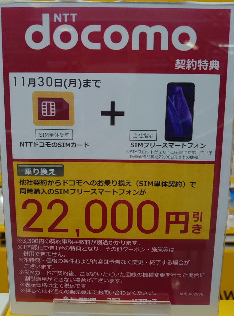 また、ビックカメラでも同条件でSIMフリーが22,000円割引です。条件として記載されている「ドコモ網」に対応しているスマートフォンとは具体的に何を意味しているのかは不明ですが、ドコモ回線の使えないSIMフリースマートフォン(ビックカメラなんば店の取扱い機種)はありません。