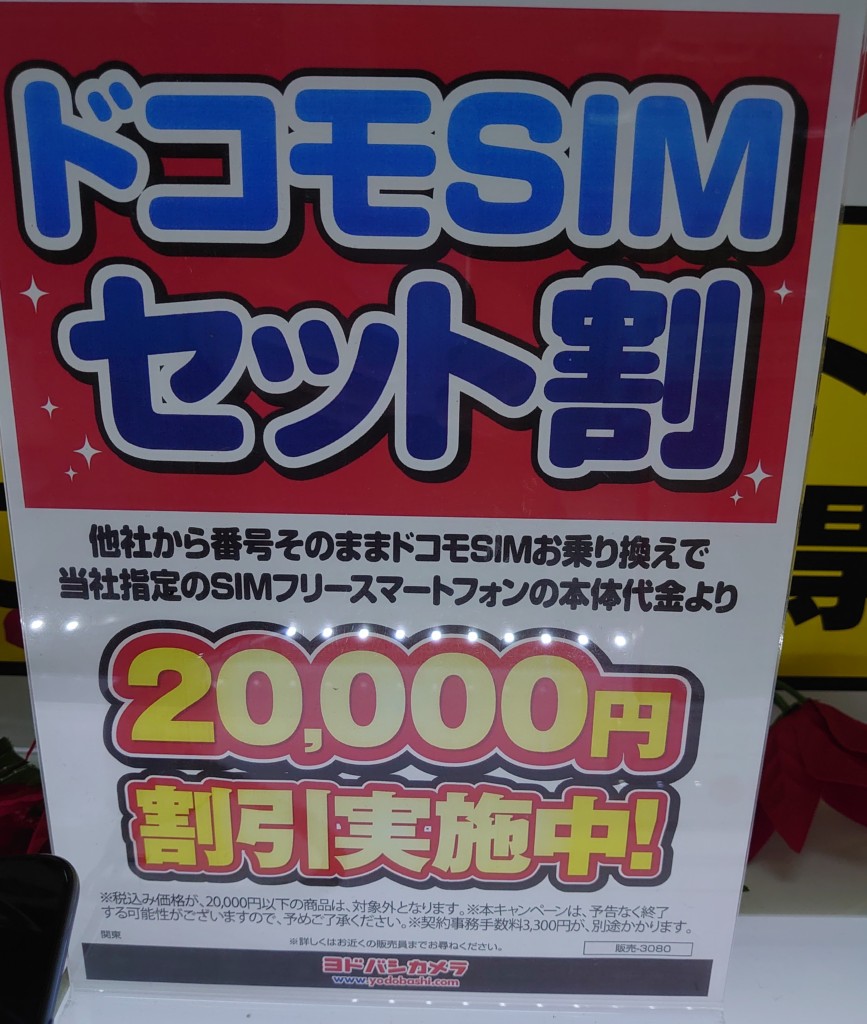 2020年11月15日(日)に確認しました。ヨドバシカメラ梅田では、ドコモのSIM単体及びMNP契約で、SIMフリースマートフォンが20,000円割引です。SIMフリーのiPhone 12シリーズも対象とのことです。