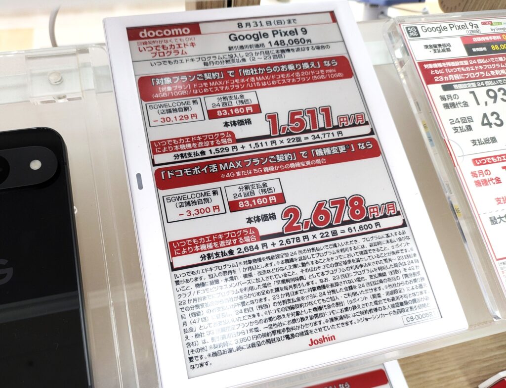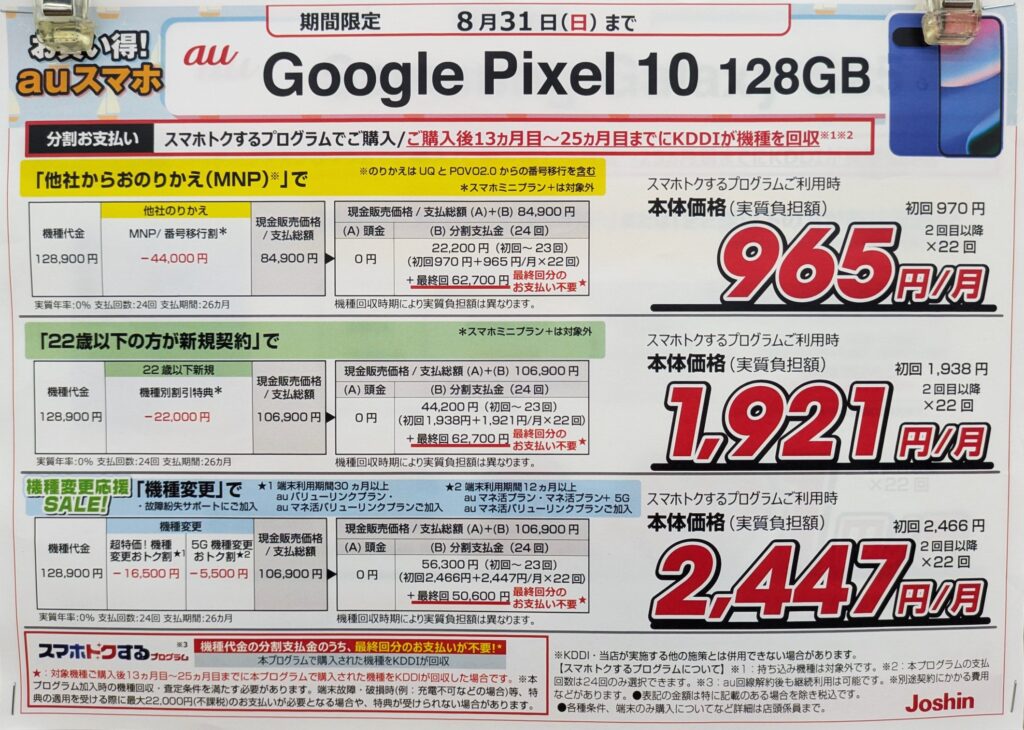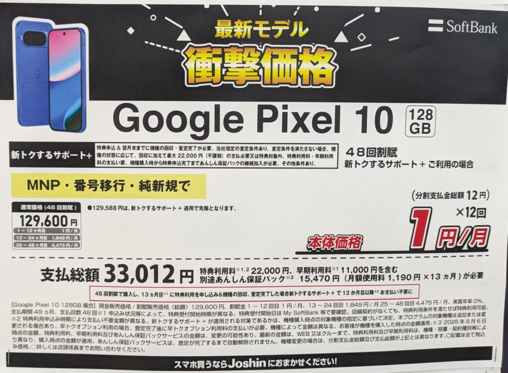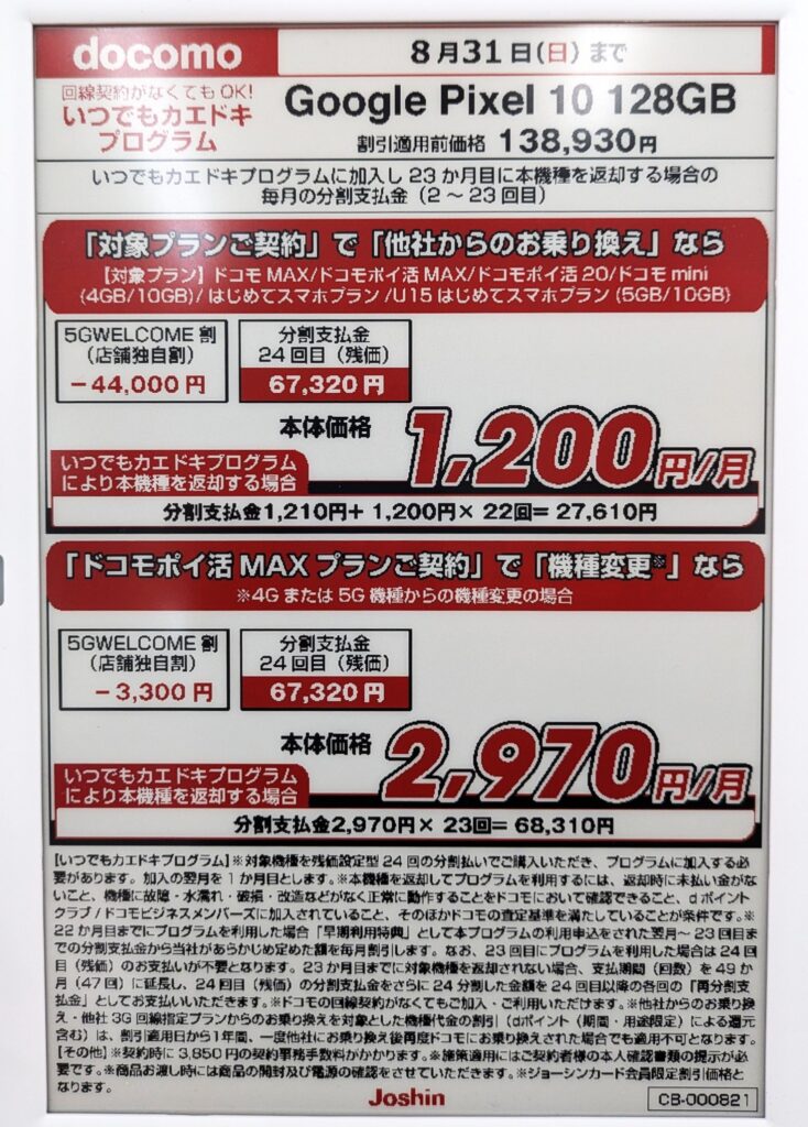 ジョーシン等の量販店では、8/28(木)発売のドコモ「Google Pixel 10(128GB)(税込138,930円)」が、MNPで▲44,000円割引で、一括94,930円(税込)となっています。