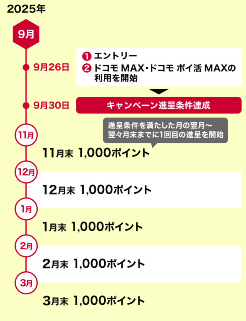 5,000dポイントは5ヵ月に分けての分割進呈です。9月に開通した場合は、11月末に1回目の1,000ポイント進呈。以後、5カ月にわたり合計5,000dポイント還元です。