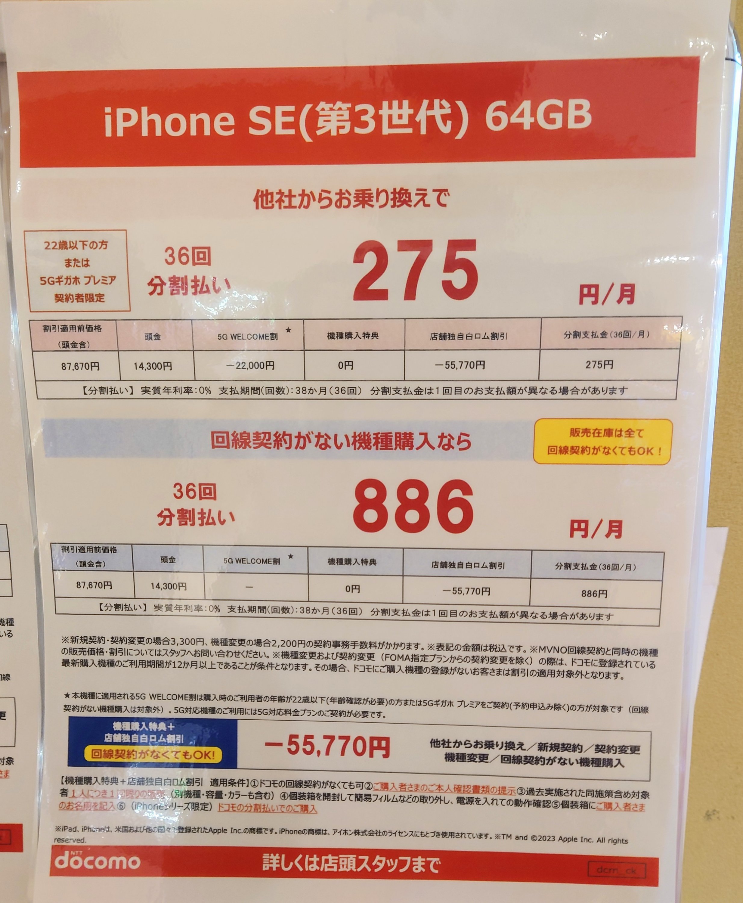 ドコモ出張所では「iPhone SE 64GB(税込87,670円・頭金含)」がMNPで一括9,900円(税込)となっています。表記は分割ですが(275円×36回払い)、一括も可能。