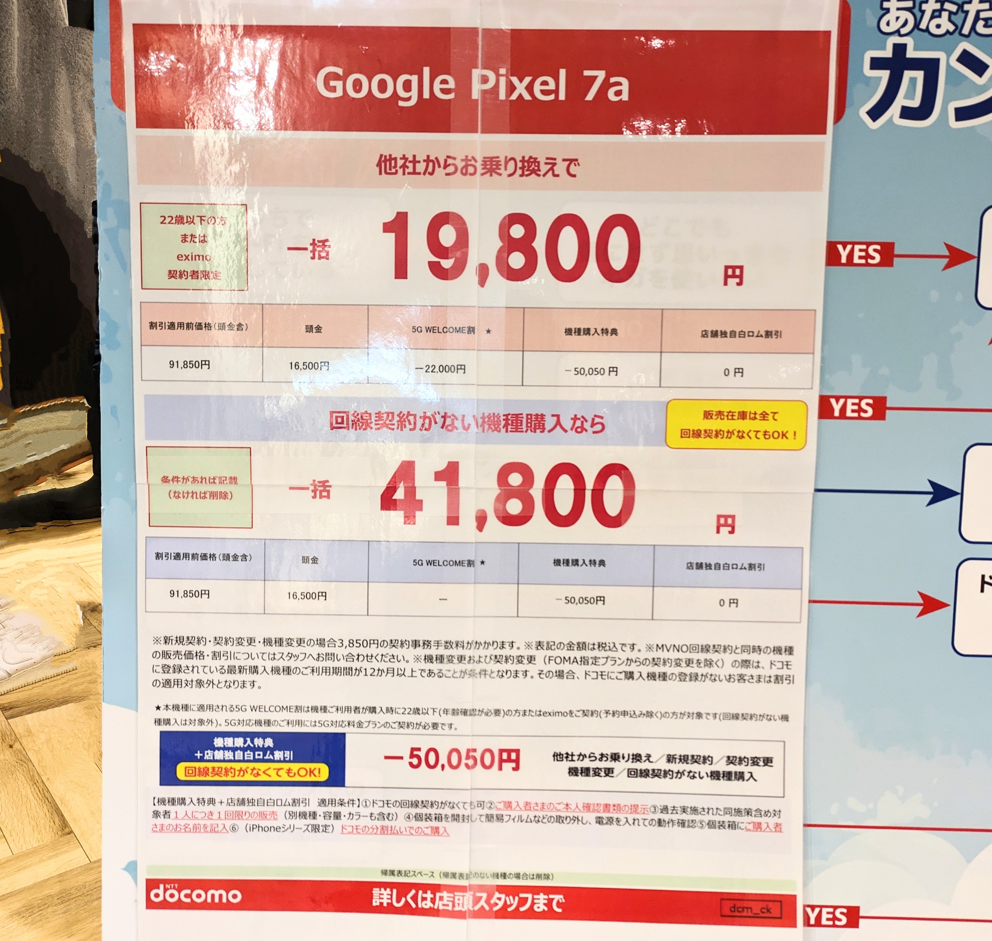 2023年11月23日(木)、イオンモールドコモ出張所では、「Google Pixel 7a(税込75,350円)」がMNP一括19,800円(税込)となっています。