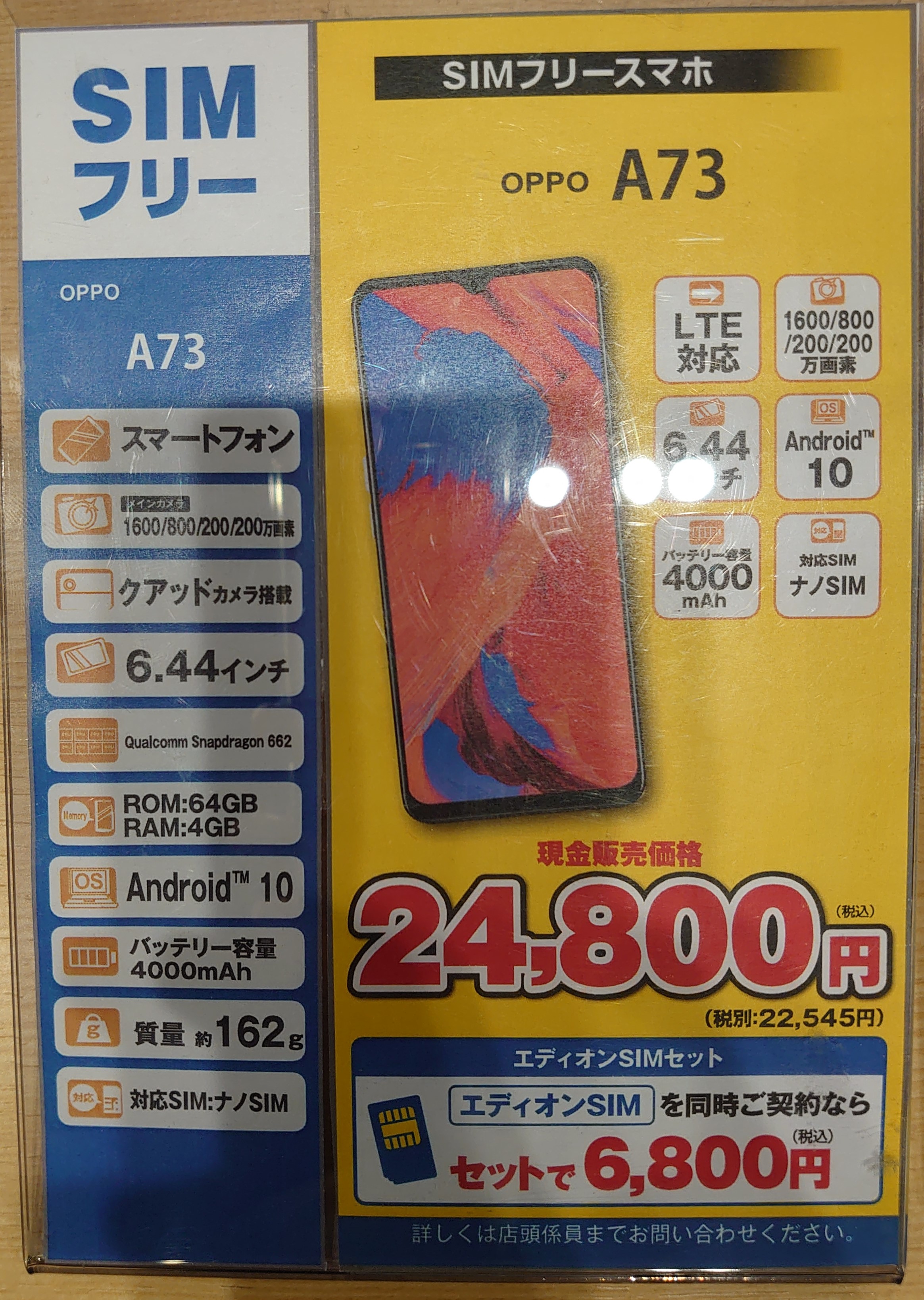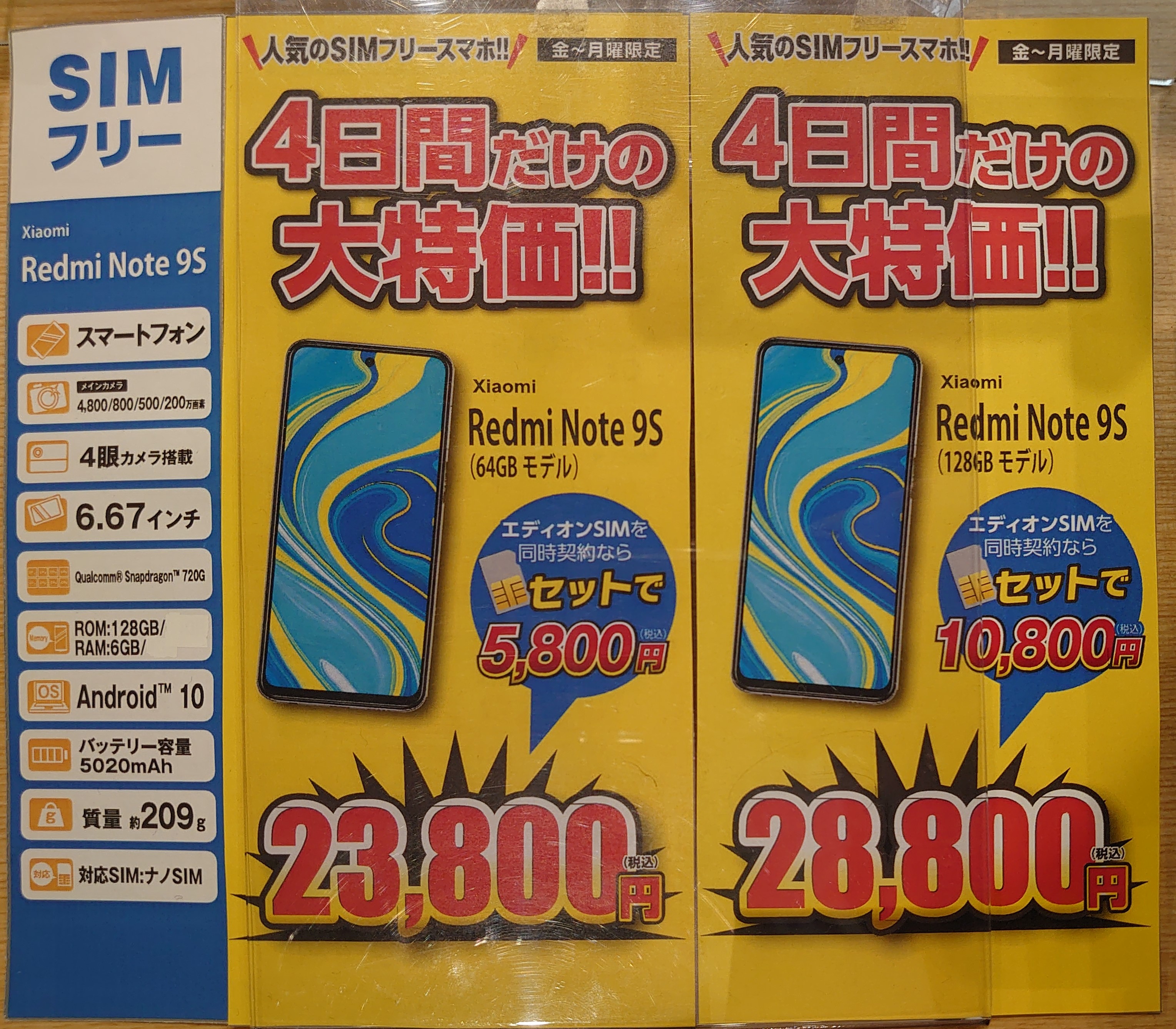また、同じくエディオンSIMセット(新規・MNP)で、端末価格の改定(値下げ)があったOPPO A73が6,800円(税込)、Xiaomi Redmi Note9S 64GBが5,800円(税込)、HUAWEI nova lite 3+が1円(税込)、HUAWEI nova 5Tが20,800円(税込)等となっています。Androidは開封、通電必須です。