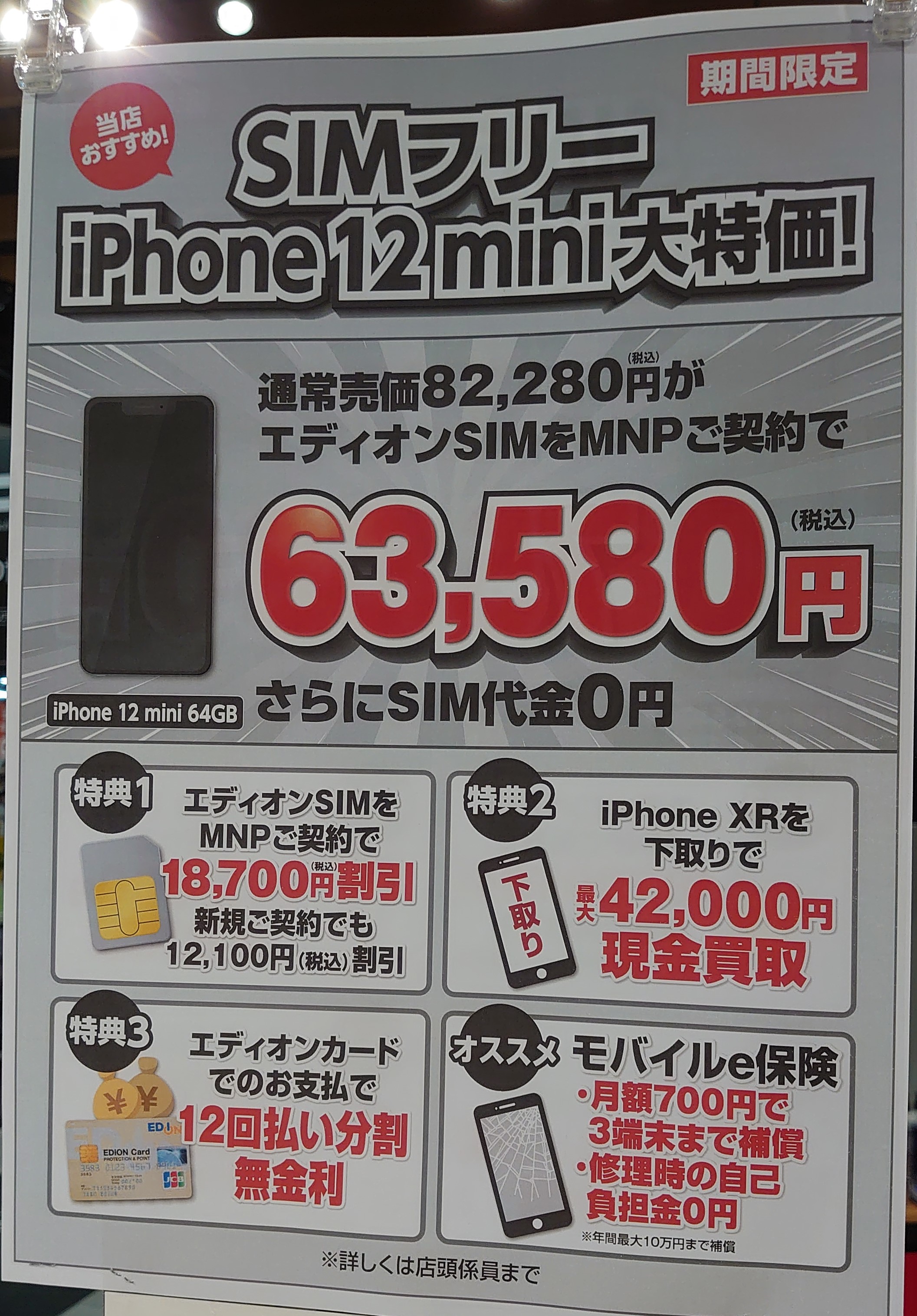 エディオンなんば本店では、エディオンSIMセット(ビッグローブ)で、「iPhone 12 mini 64GB」 SIMフリーがMNPで63,580円(税込)です。MNPで18,700円割引、新規で12,100円割引となります。初売では新規でも18,700円割引でしたが、割引額減となっています。未開封渡しです。