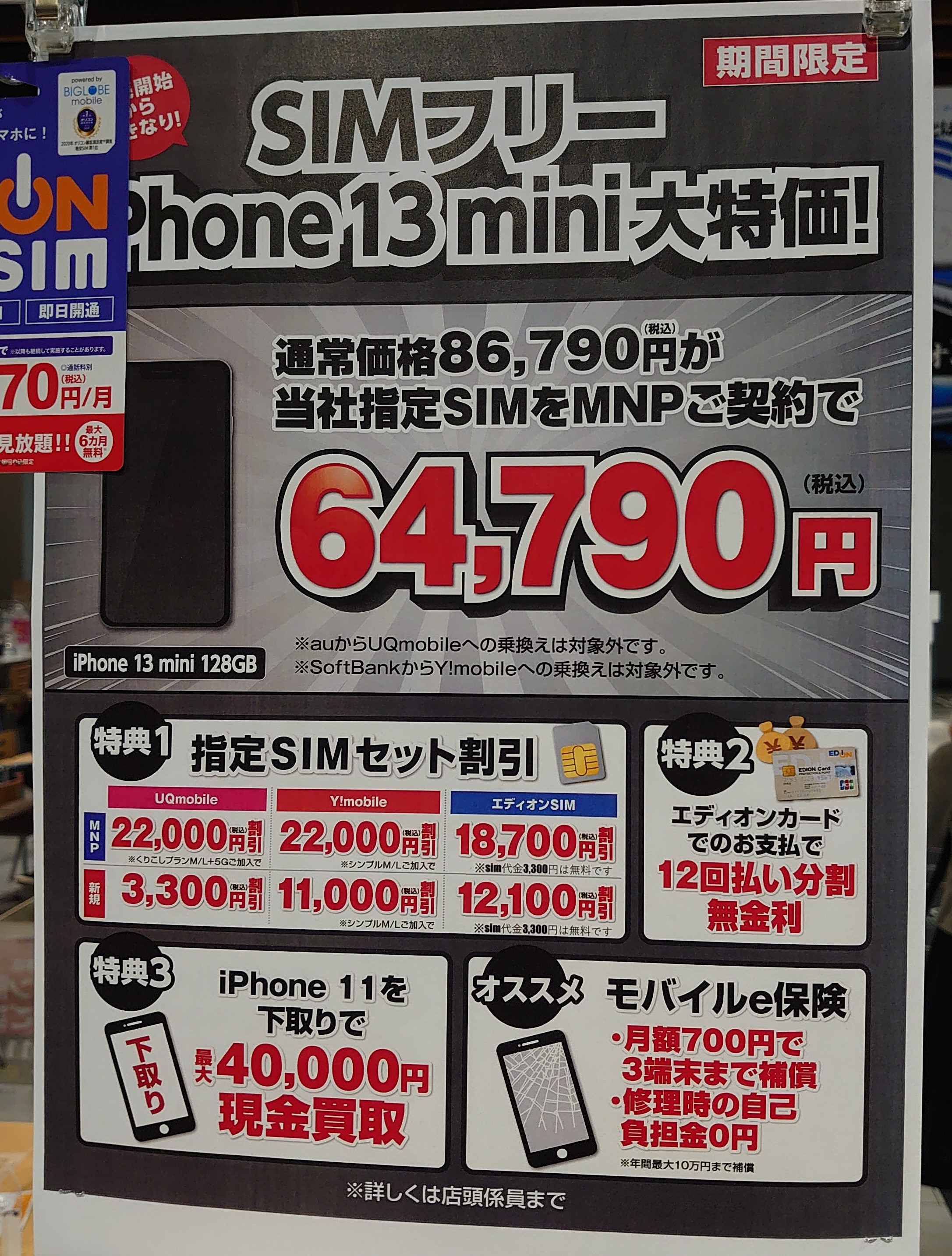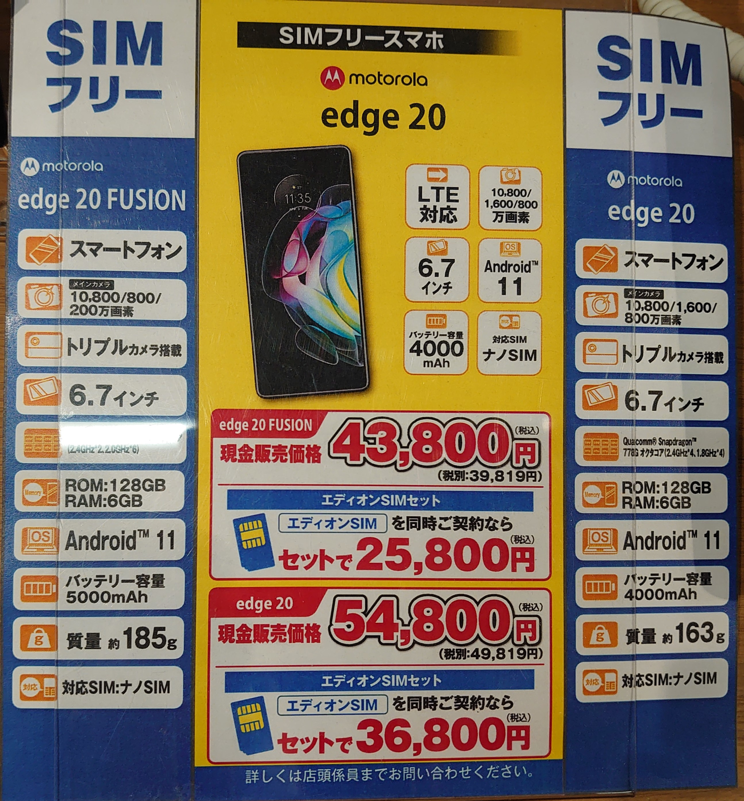 こちらはエディオンSIMセットでもそこそこ安いです。PayPayキャンペーンも利用出来ますが、肝心のエディオンポイント還元が10%か1%かを聞き忘れてしまいました。興味がある方は店舗でご確認下さい。
