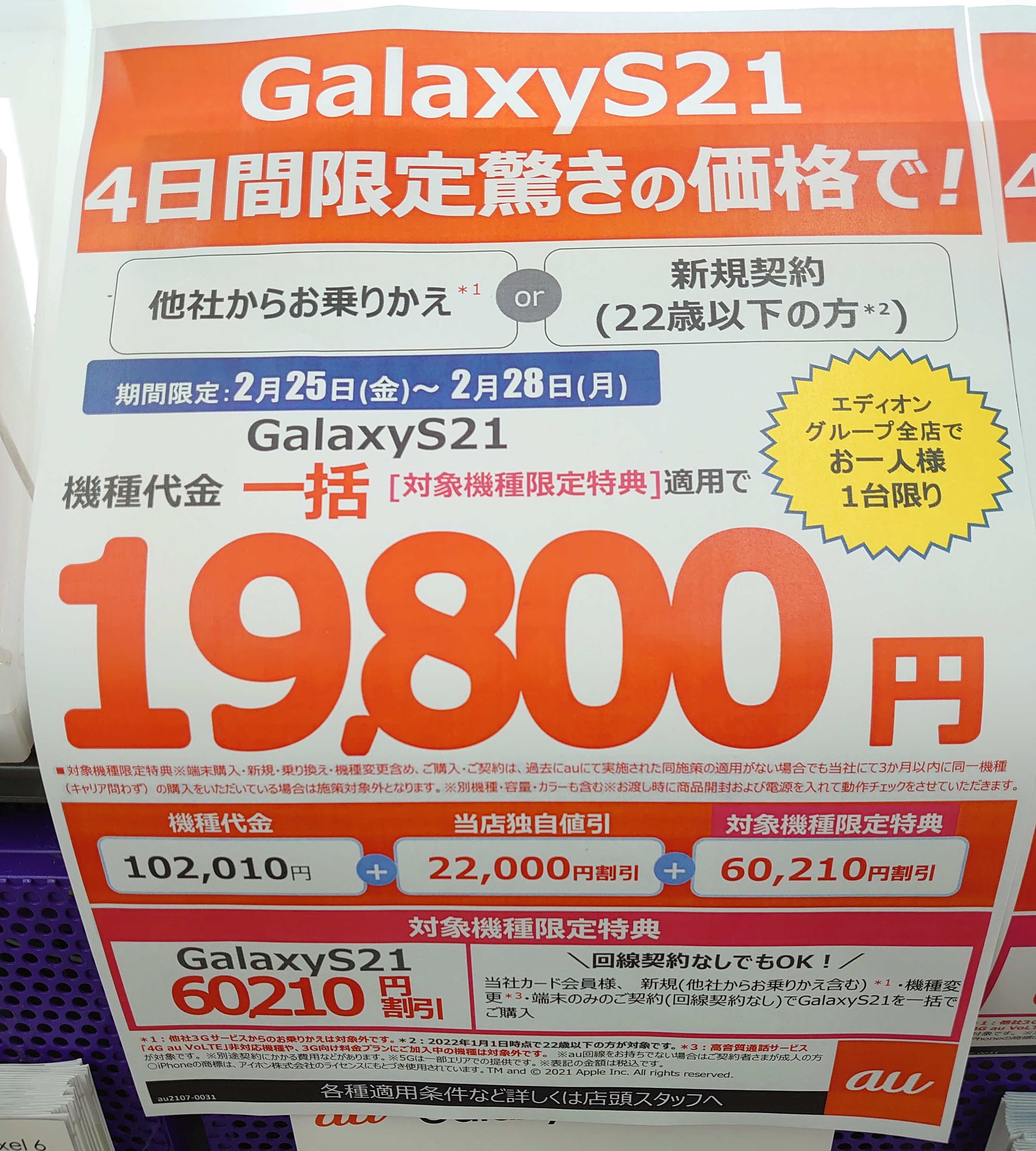 auの「Galaxy S21 5G SCG09」は引き続きMNP一括19,800円(税込)です。