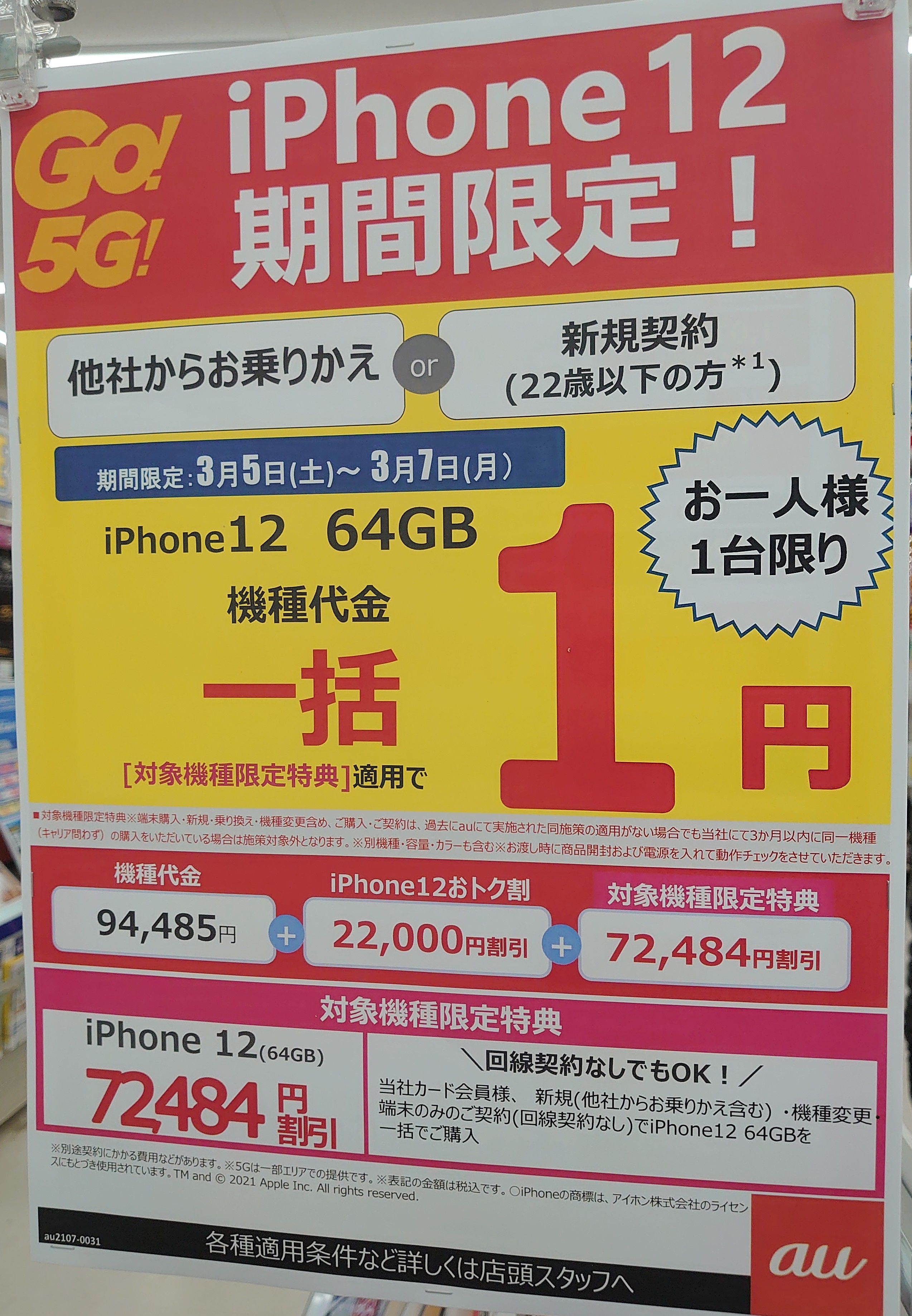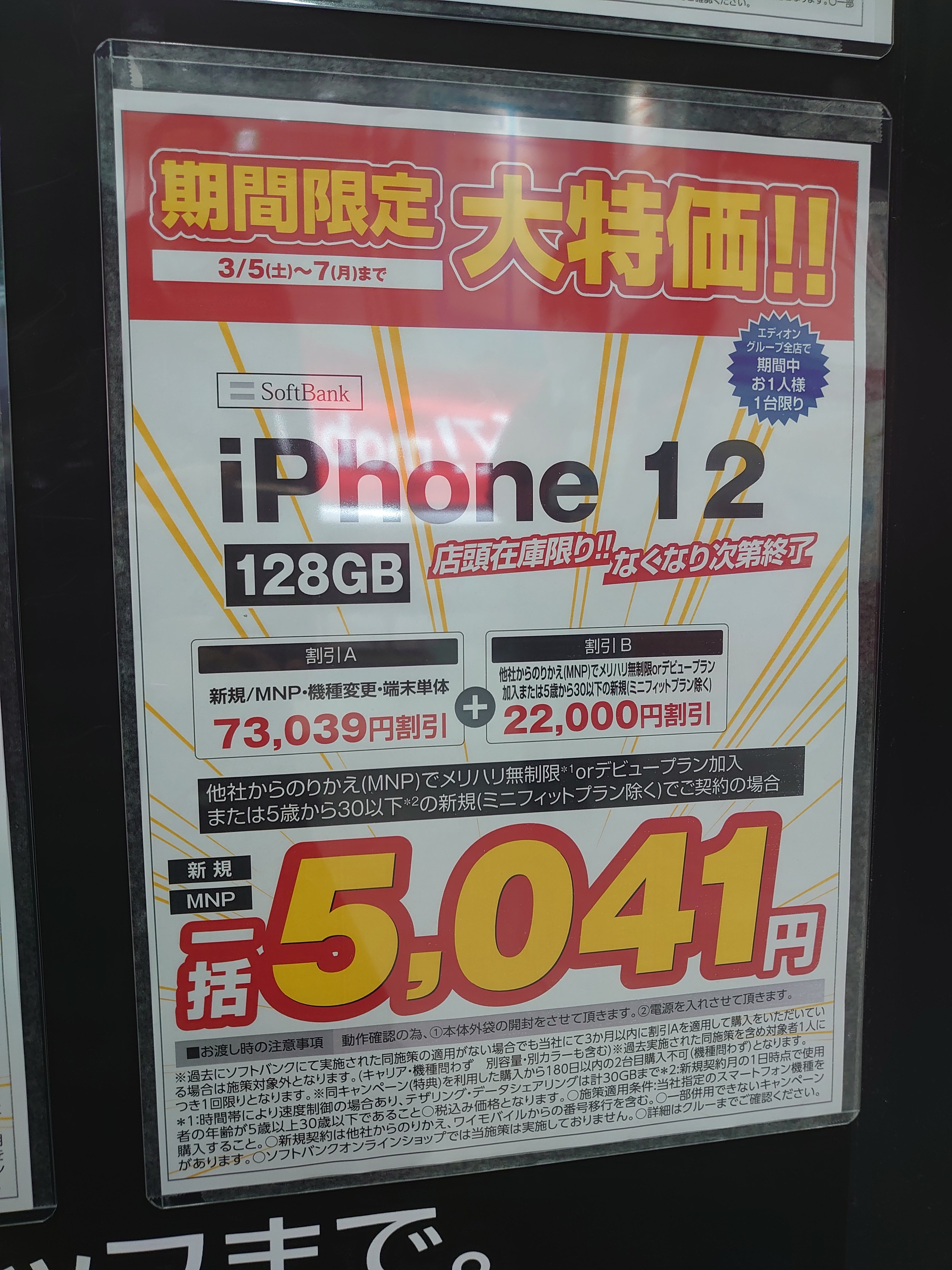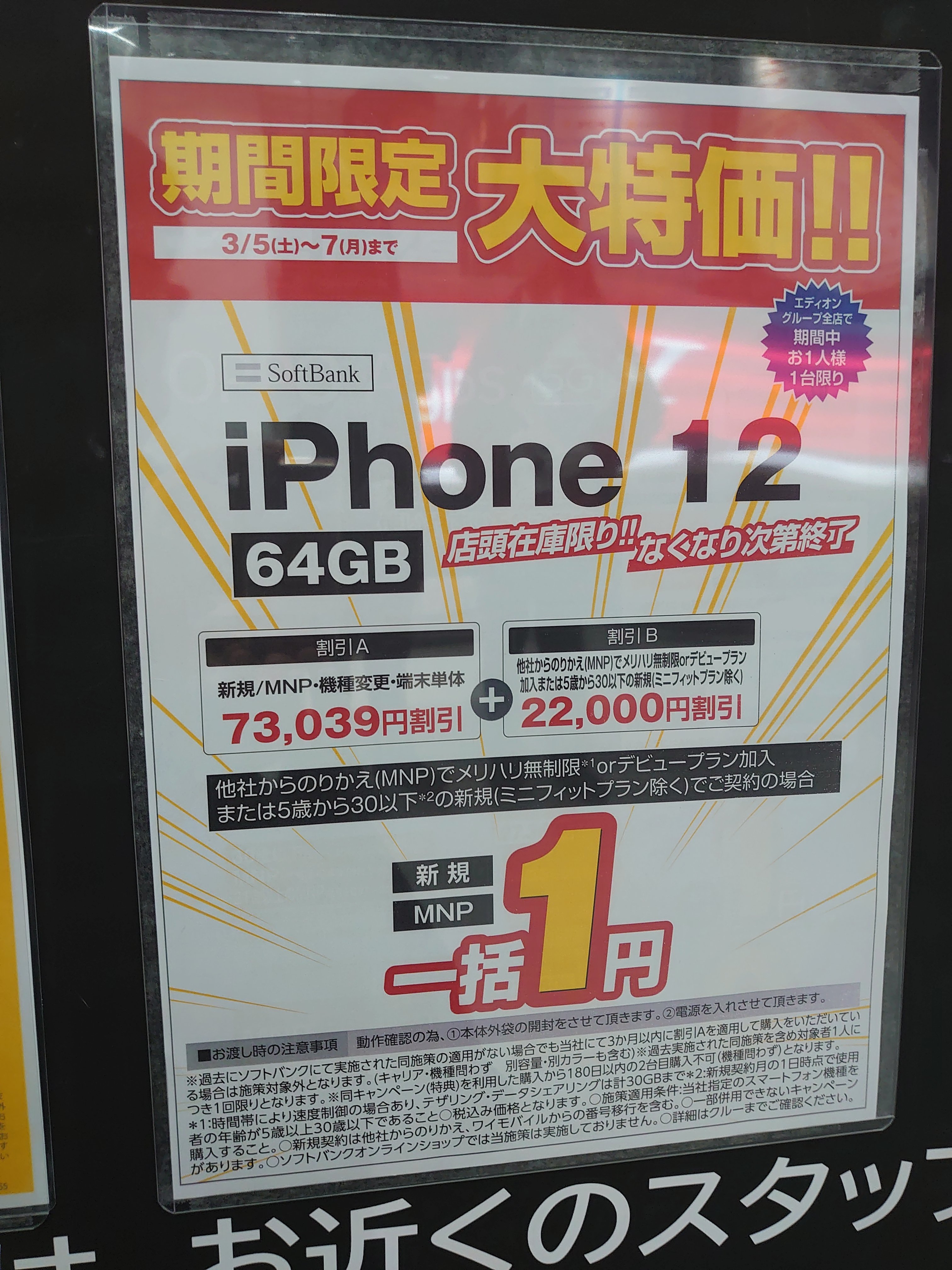 【3/5〜】エディオンでソフトバンク「iPhone 12 64GB」がMNP一括1円/エディオン 2022 3/05 ソフトバンク 2022年3月5日 当ページにはアフィリエイト広告が含まれています。 3キャリアともMNP一括1円とのことですが、なんば本店は在庫無しとのことです。 ソフトバンク よかったらシェアしてね! URLをコピーしました! URLをコピーしました! この記事を書いた人 Sakura R5G ケータイ特価情報をお届けします。 遠慮なくコメント頂ければ結構ですが、コメントは私が承認するまで表示されませんので、ご注意下さい。 ※2024年7月1日より、参考程度の投稿以外はX(旧ツイッター)に投稿しようと思っています。 人気記事 ワイモバイル 【8/14(木)より】価格(再)更新、ワイモバイル「Google Pixel 8a」が機種変更で49,536円にPayPay還元/事務手数料0円/ヤフーショッピング店 2025年8月14日 ワイモバイル 【2025/11版】ワイモバイル「iPhone 13(認定中古品)」が機種変更一括29,520円/事務手数料3,850円/オンラインストア 2025年11月9日 楽天モバイル 【2025/12版】楽天モバイル「nubia S2R」や「Galaxy A25 5G」がMNP一括1円/事務手数料0円 2025年12月2日 ドコモ 【2025/8版】ahamoへのSIMのみMNPで20,000dポイント(分割進呈)/事務手数料0円/NTTドコモ 2025年8月10日 楽天モバイル 【7/1(火)より】楽天モバイルへのMNPで▲22,000円割引/「Nothing Phone (3a)」が一括32,890円など/事務手数料0円 2025年7月1日 新着記事 【1/10(土)】 Joshin webで「Xiaomi 14T Pro 512GB(パッケージ不良)」が79,800円 【1/15(木)発売】楽天モバイル「Nothing Phone (3a) Lite」が32,890円/はじめて申し込み&MNPで16,000ポイント/2回線目以降は新規で6,000ポイント 【1/13(火)まで】UQモバイル「自宅セット割」適用で10,000ポイント追加還元/ビックカメラ コメント コメント一覧 (7件) 3/9にiPhone se3発表予定のようですが、その後は状況が変わりますかねー。 返信 とりあえず3月のiPhone12以降は落ち着くんじゃないですかね~ 返信 本日、エディオン難波のドコモで話を聞いたところ、エコノミーでの値引きは一切不可と非常に高圧的な態度で言われました。 エディオン難波はもうダメですね。 返信 あっ、そうなんですか。私も、今後はナンバドコモで特別割引は利用出来ないと宣告されました(笑) 返信 SBのスマホスタートはガラケーの番号表示だけで行けますカ|д゚)チラッ 返信 行けると思いますよ。 返信 なんで3/7までなんでしょうね。 返信 コメントする コメントをキャンセルコメント ※ 名前 メール サイト 新しいコメントをメールで通知 新しい投稿をメールで受け取る