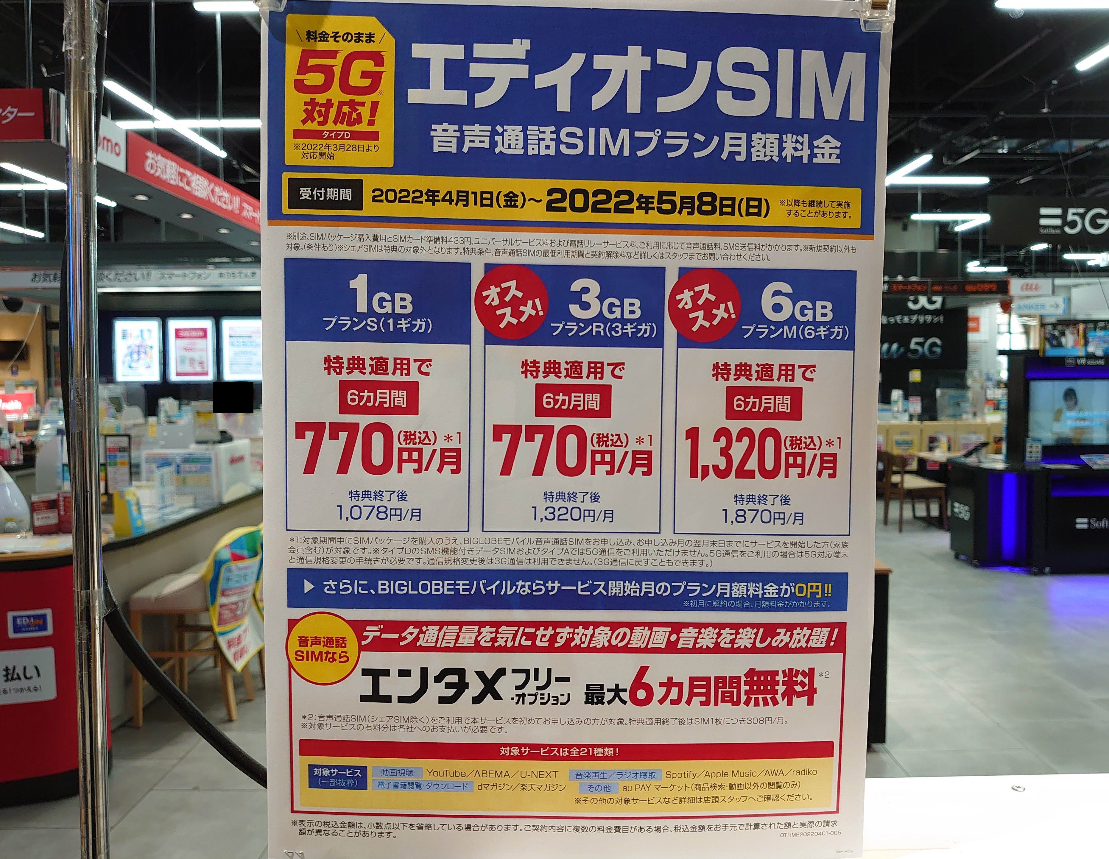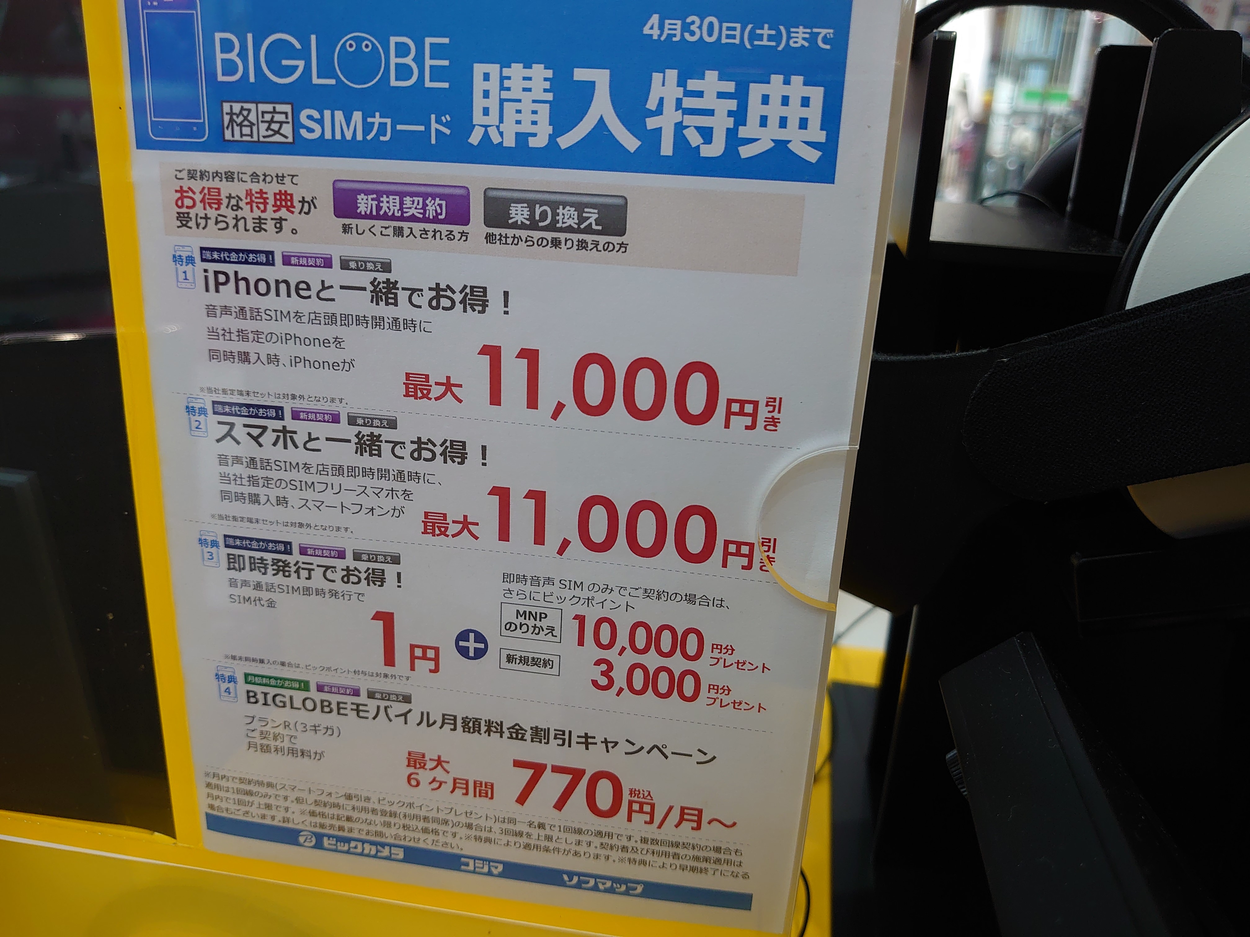 また、月額料金特典も若干条件が悪くなっています。先月までは1GB550円/月でしたが、ポップを見る限りは770円/月となっているようです。特典期間も12ヵ月から6ヵ月に変更です。