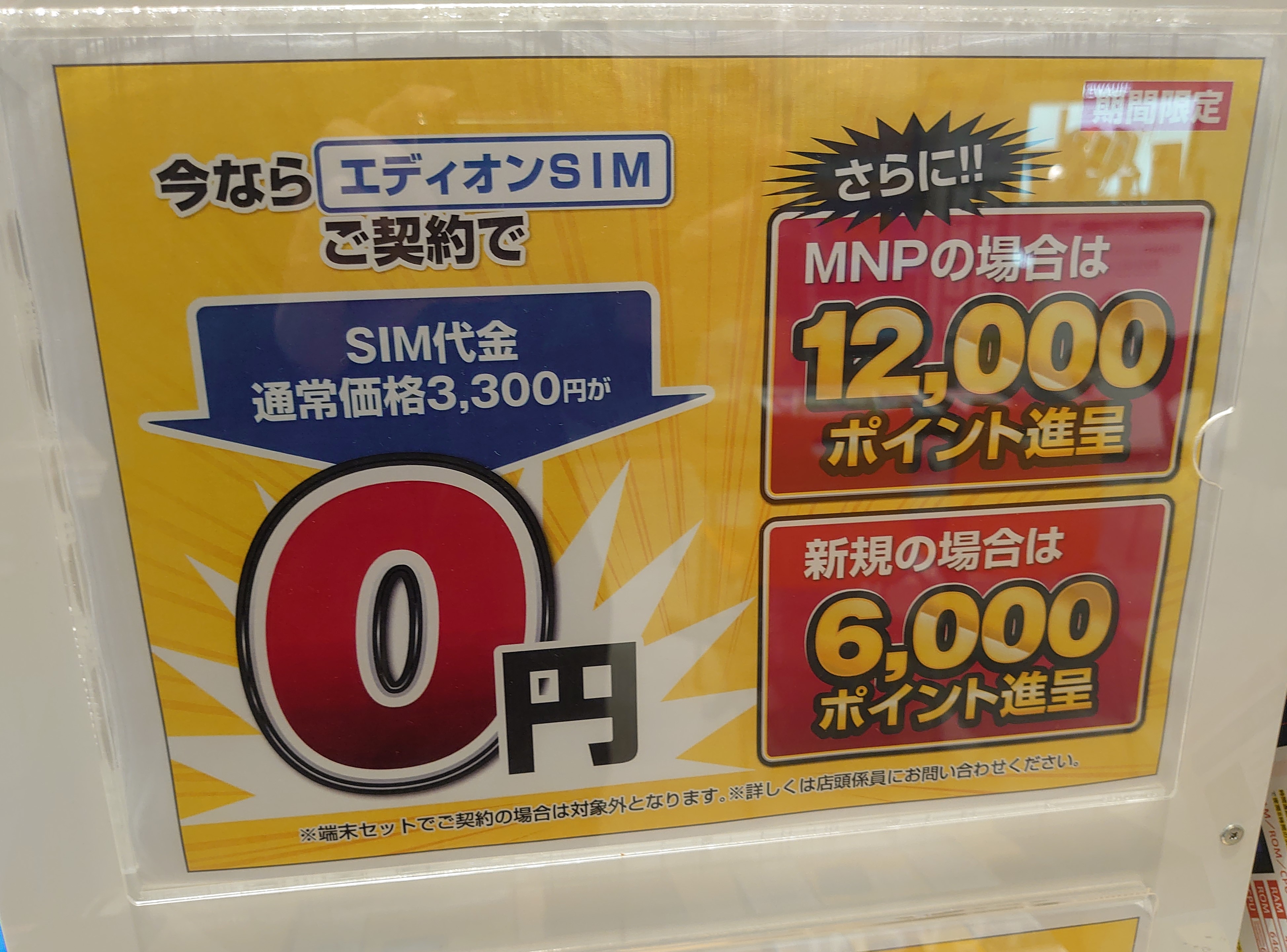 エディオンなんば本店では、エディオンSIMのみMNPで12,000ポイント還元で、先月までの18,000ポイントから大幅減となっています。事務手数料は0円。