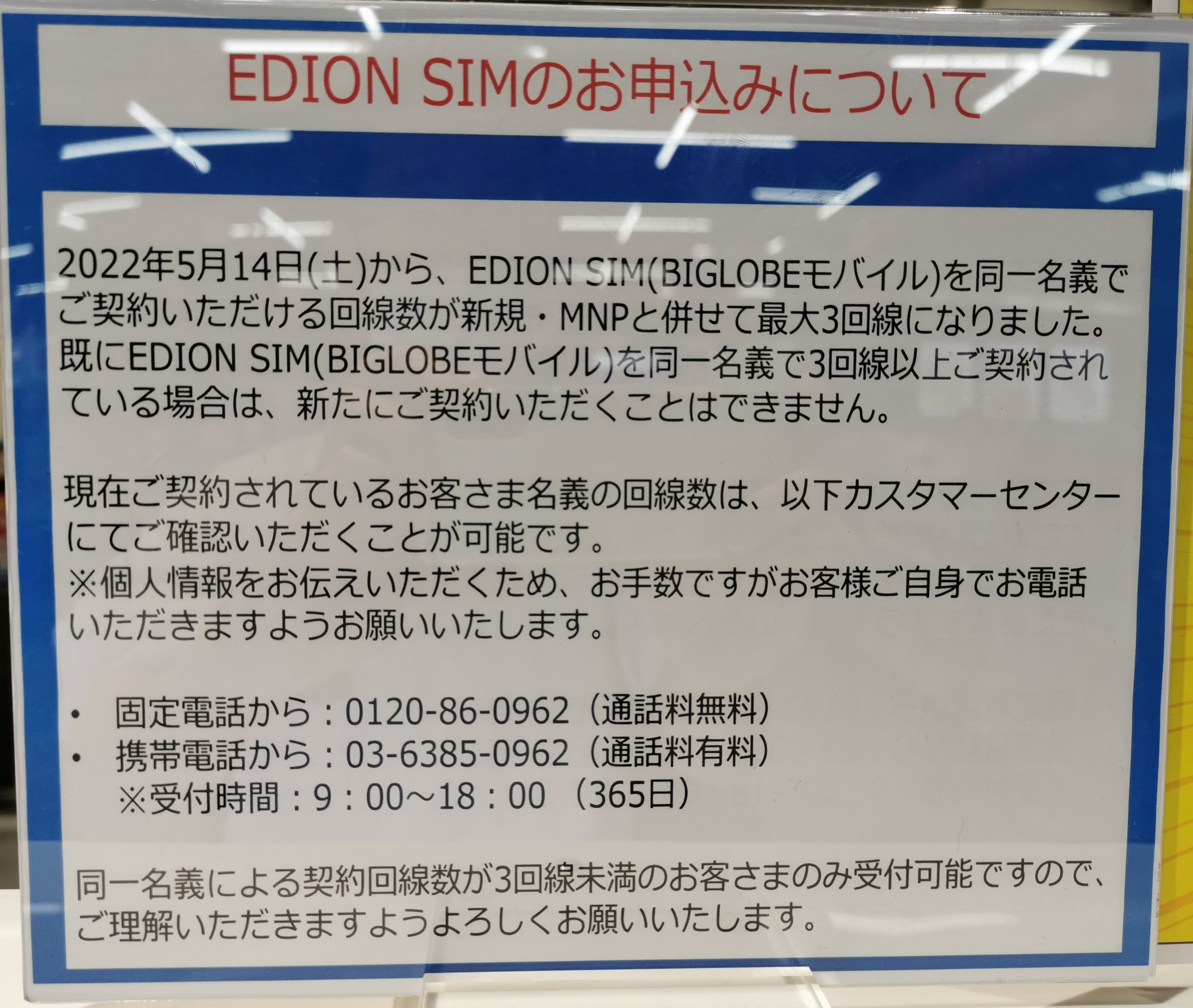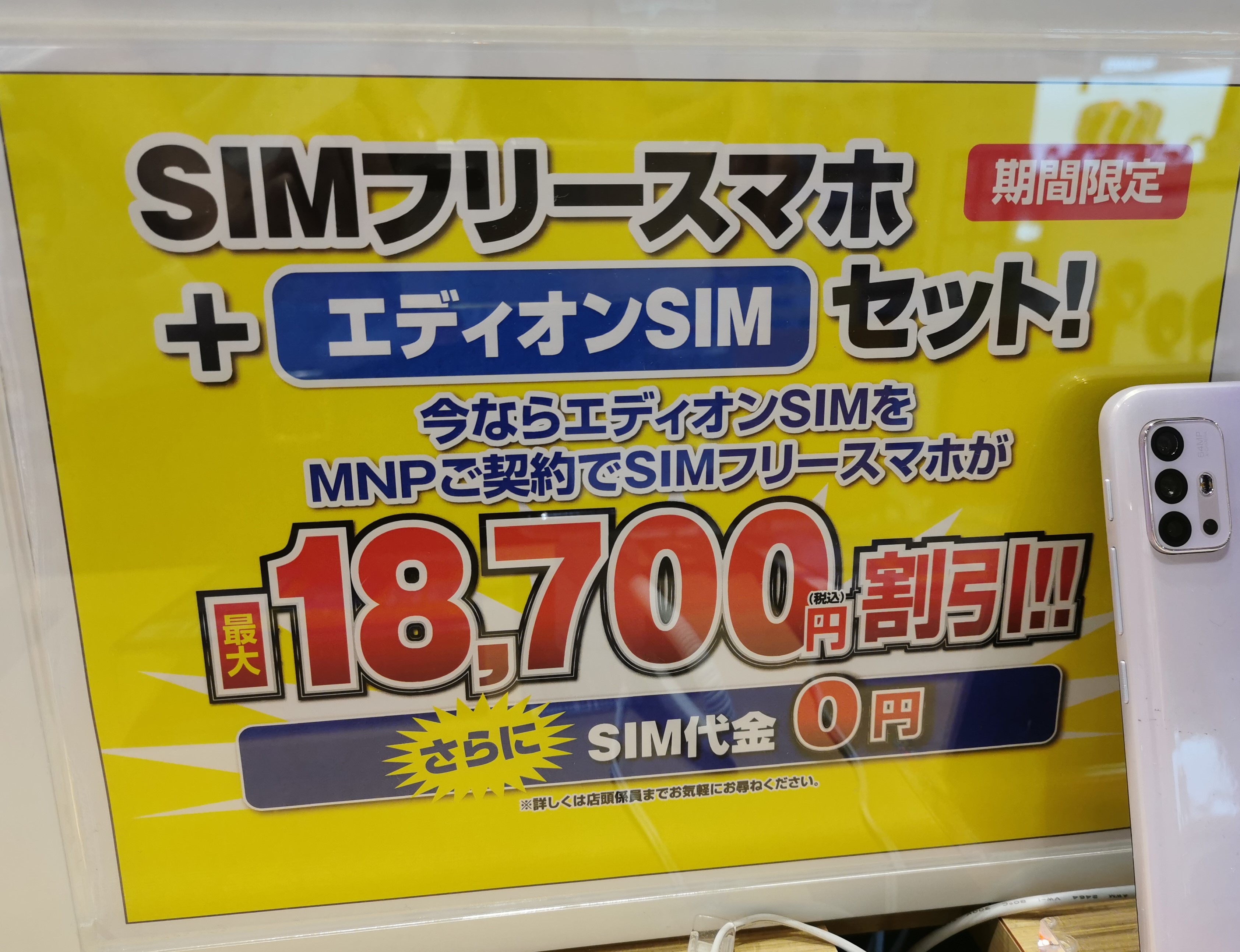 エディオンでは、ビッグローブことエディオンSIMへのMNPで、18,000エディオンポイント還元となっています。5/31(火)まで。契約可能回線数が1名義3回線までということで、既に3回線契約されている方は契約不可です。