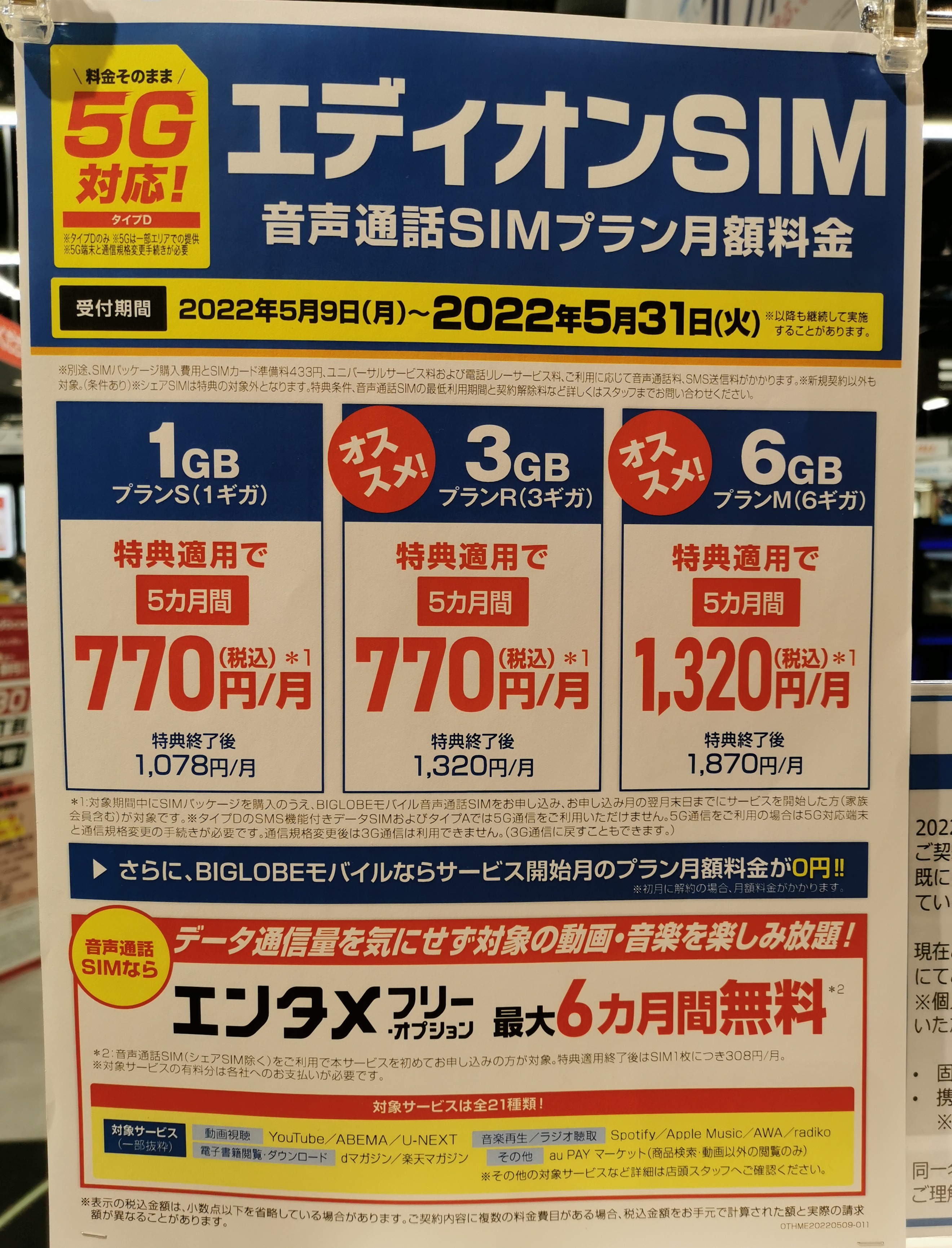 また、月額基本料金の特典ですが6ヵ月間→5ヵ月間に短縮されており、5ヵ月間は3GBで770円/月(税込)で利用可能です。以前は特典が12ヵ月間だったり、550円/月~だったりしていたので、シレっとちょっとずつ悪くなっていきますね。