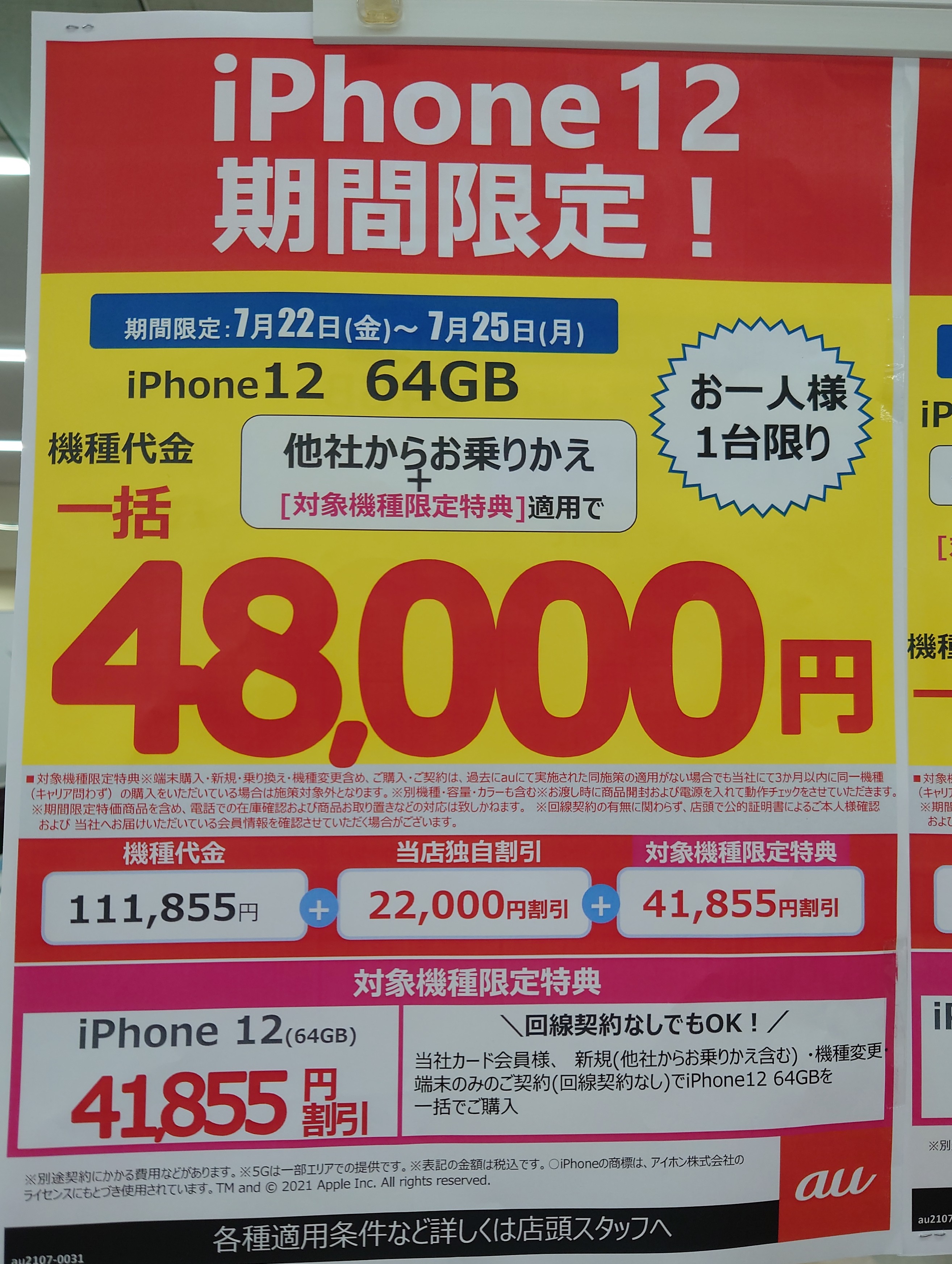 エディオンでは、au「iPhone 12 64GB(税込111,855円)」がMNP一括48,000円(税込)となっています。事務手数料は3,300円(税込)。7/25(月)まで。
