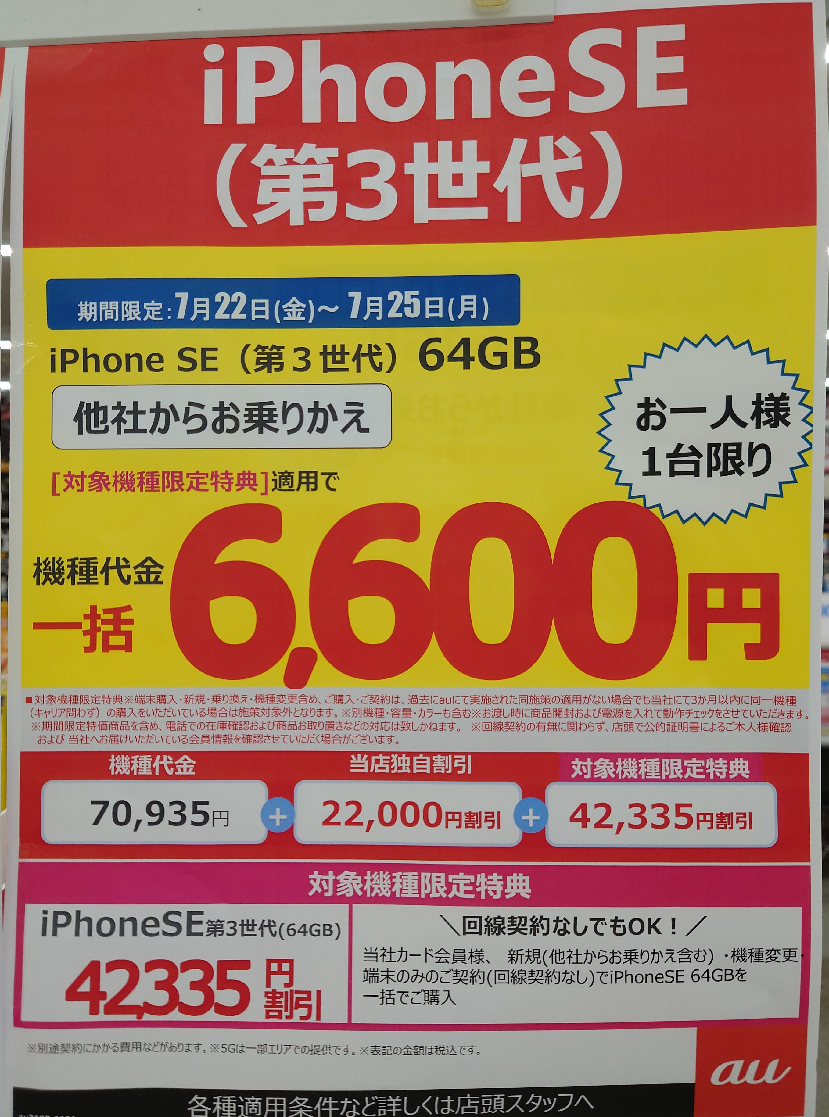 au「iPhone SE 64GB(税込70,935円)」の方は、本体価格値上げ後も引き続きお買い得になっています。