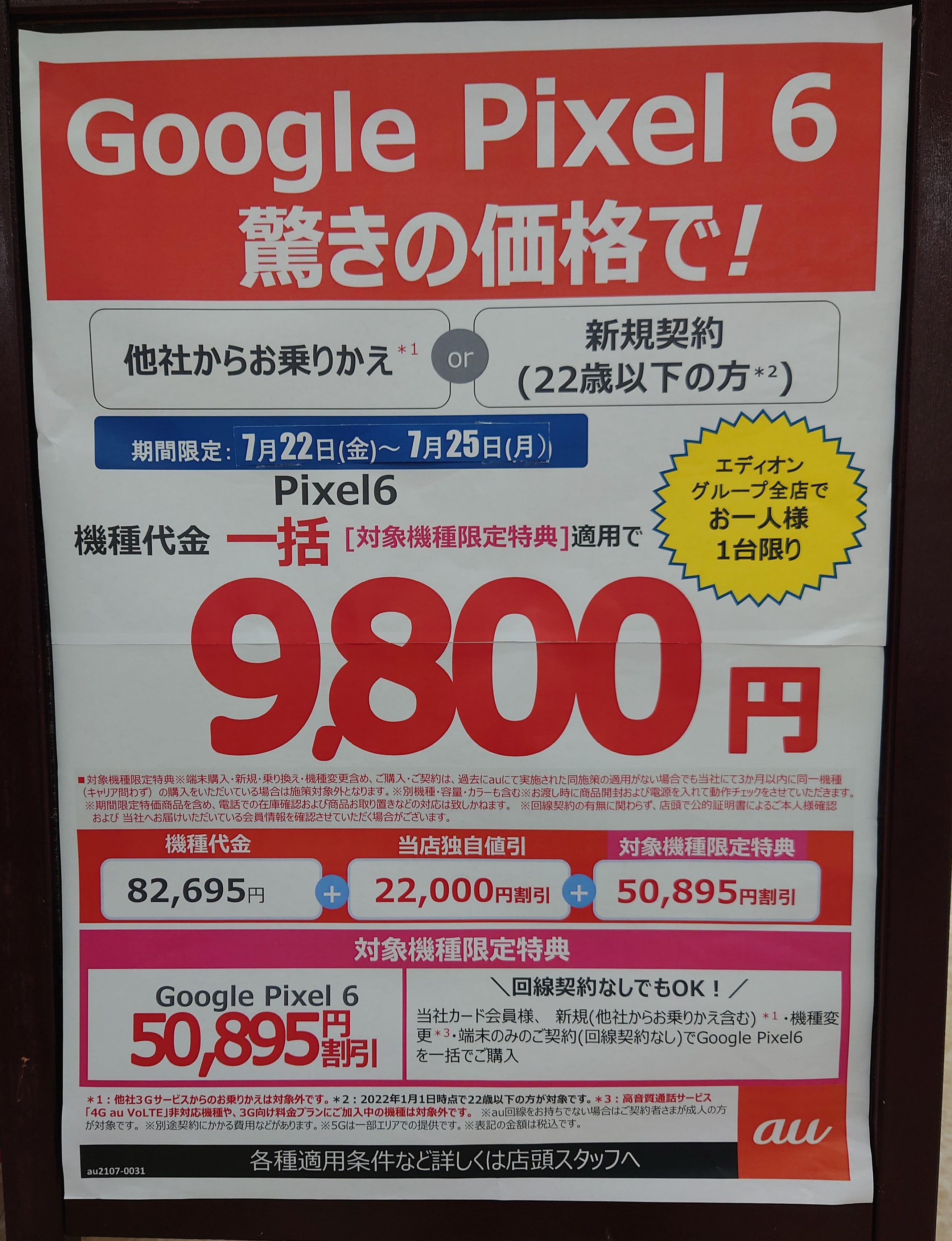 ヤマダ電機では、au「Google Pixel 6(税込82,695円)」がMNP一括9,800円(税込)となっています。7/25(月)まで。