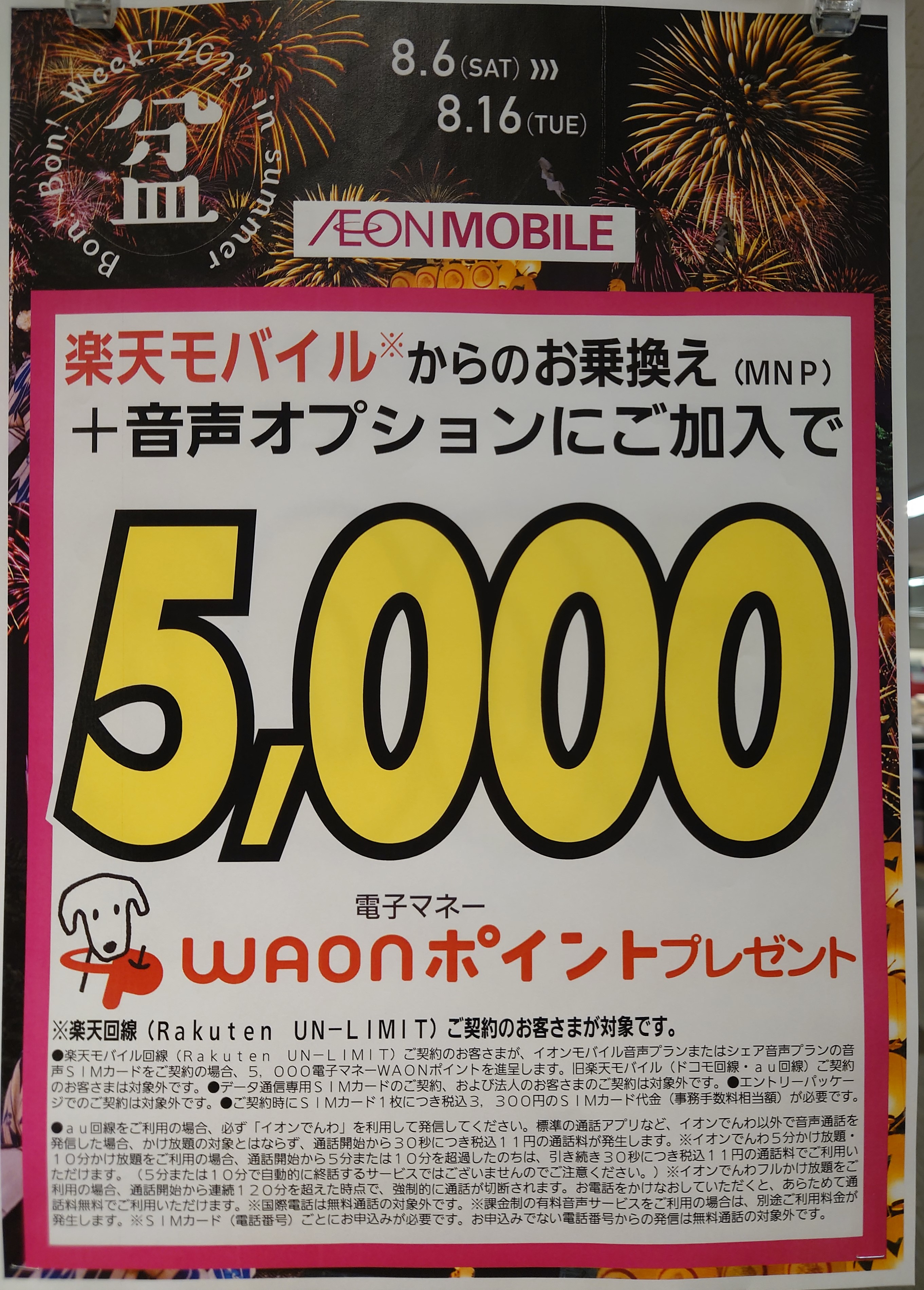MNPにて音声SIMカードを契約で、毎月の利用料金の支払いクレジットカードにイオンマークの付いたカードを登録の場合、2,000WAONポイント進呈となります。