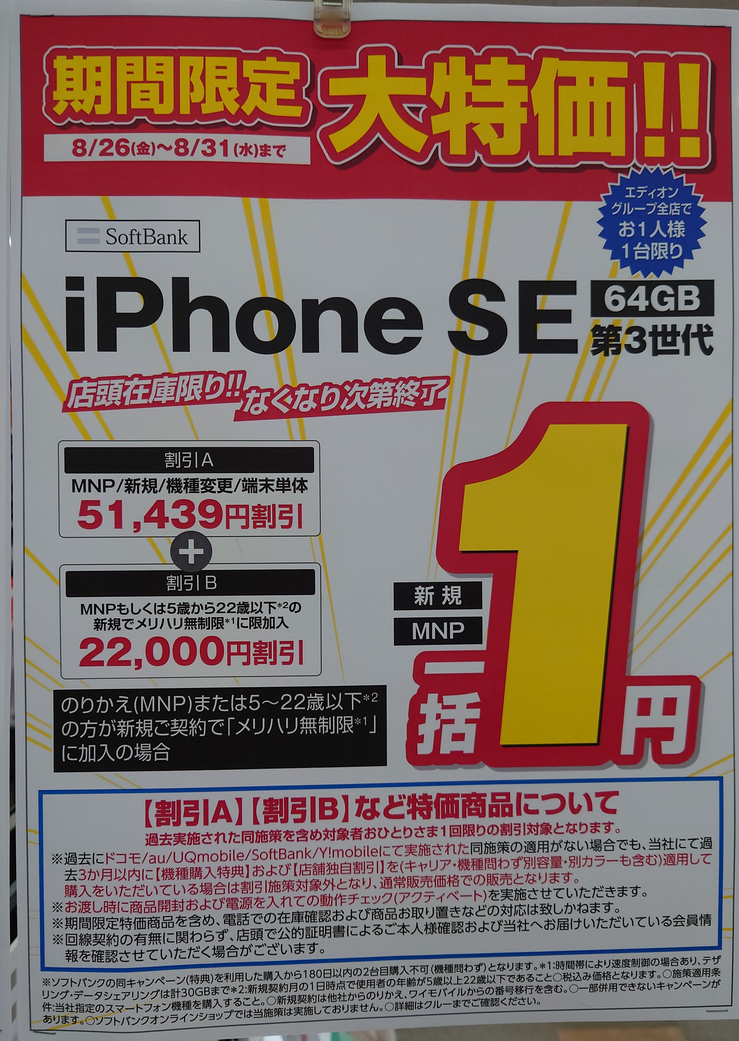 【8/29(月)まで】ドコモ「iPhone SE 64GB」がMNP一括1円/エディオン 2022 8/26 ソフトバンク ドコモ 2022年8月26日 当ページにはアフィリエイト広告が含まれています。 エディオンではドコモ「iPhone SE 64GB(税込73,370円)」がMNP一括1円(税込)となっています。8/29(月)まで。 明日土曜日にならないと明確には分かりませんが、各量販店3キャリアとも一括1円になるようですね。 ソフトバンク ドコモ よかったらシェアしてね! URLをコピーしました! URLをコピーしました! この記事を書いた人 Sakura R5G ケータイ特価情報をお届けします。 遠慮なくコメント頂ければ結構ですが、コメントは私が承認するまで表示されませんので、ご注意下さい。 ※2024年7月1日より、参考程度の投稿以外はX(旧ツイッター)に投稿しようと思っています。 人気記事 ワイモバイル 【8/14(木)より】価格(再)更新、ワイモバイル「Google Pixel 8a」が機種変更で49,536円にPayPay還元/事務手数料0円/ヤフーショッピング店 2025年8月14日 ワイモバイル 【2025/11版】ワイモバイル「iPhone 13(認定中古品)」が機種変更一括29,520円/事務手数料3,850円/オンラインストア 2025年11月9日 楽天モバイル 【2025/12版】楽天モバイル「nubia S2R」や「Galaxy A25 5G」がMNP一括1円/事務手数料0円 2025年12月2日 ドコモ 【2025/8版】ahamoへのSIMのみMNPで20,000dポイント(分割進呈)/事務手数料0円/NTTドコモ 2025年8月10日 楽天モバイル 【7/1(火)より】楽天モバイルへのMNPで▲22,000円割引/「Nothing Phone (3a)」が一括32,890円など/事務手数料0円 2025年7月1日 新着記事 【1/10(土)】 Joshin webで「Xiaomi 14T Pro 512GB(パッケージ不良)」が79,800円 【1/15(木)発売】楽天モバイル「Nothing Phone (3a) Lite」が32,890円/はじめて申し込み&MNPで16,000ポイント/2回線目以降は新規で6,000ポイント 【1/13(火)まで】UQモバイル「自宅セット割」適用で10,000ポイント追加還元/ビックカメラ コメント コメントする コメントをキャンセルコメント ※ 名前 メール サイト 新しいコメントをメールで通知 新しい投稿をメールで受け取る