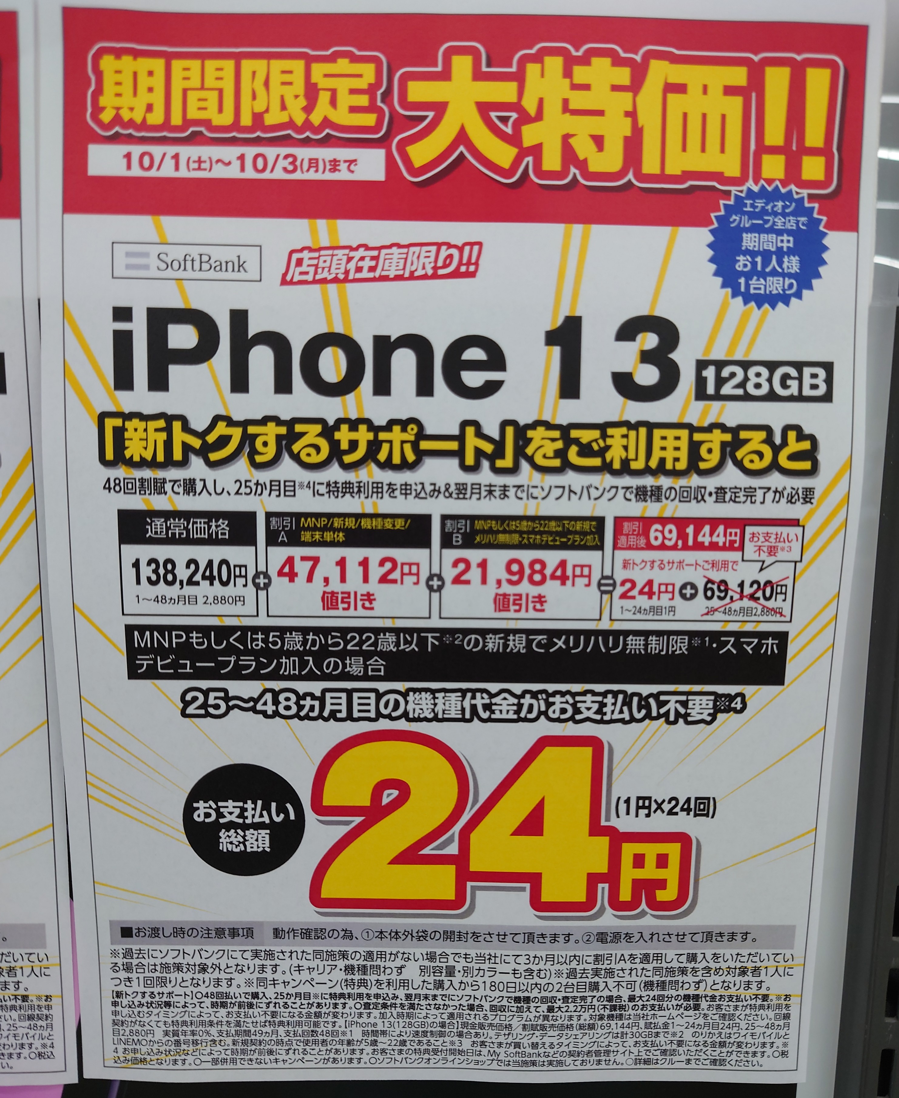 ソフトバンク「iPhone 13 128GB(税込138,240円)」も概ねauと同様です。MNP若しくはU22新規で69,096円割引となり、総額69,144円(税込)です。