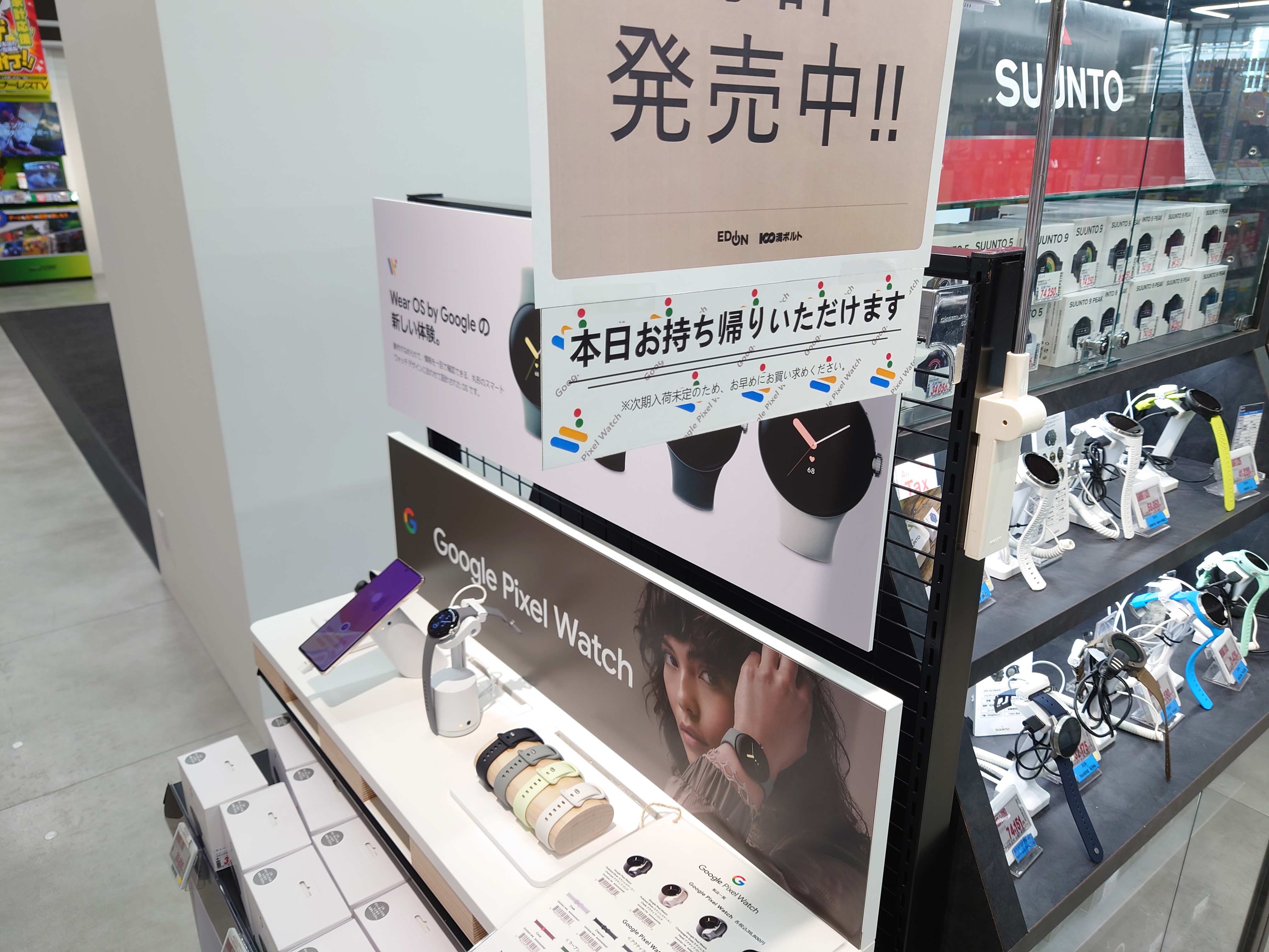 2022年10月15日(土)、エディオンなんば本店では「Google Pixel Watch(税込39,800円)」が、ブラック以外は在庫有りとなっています。