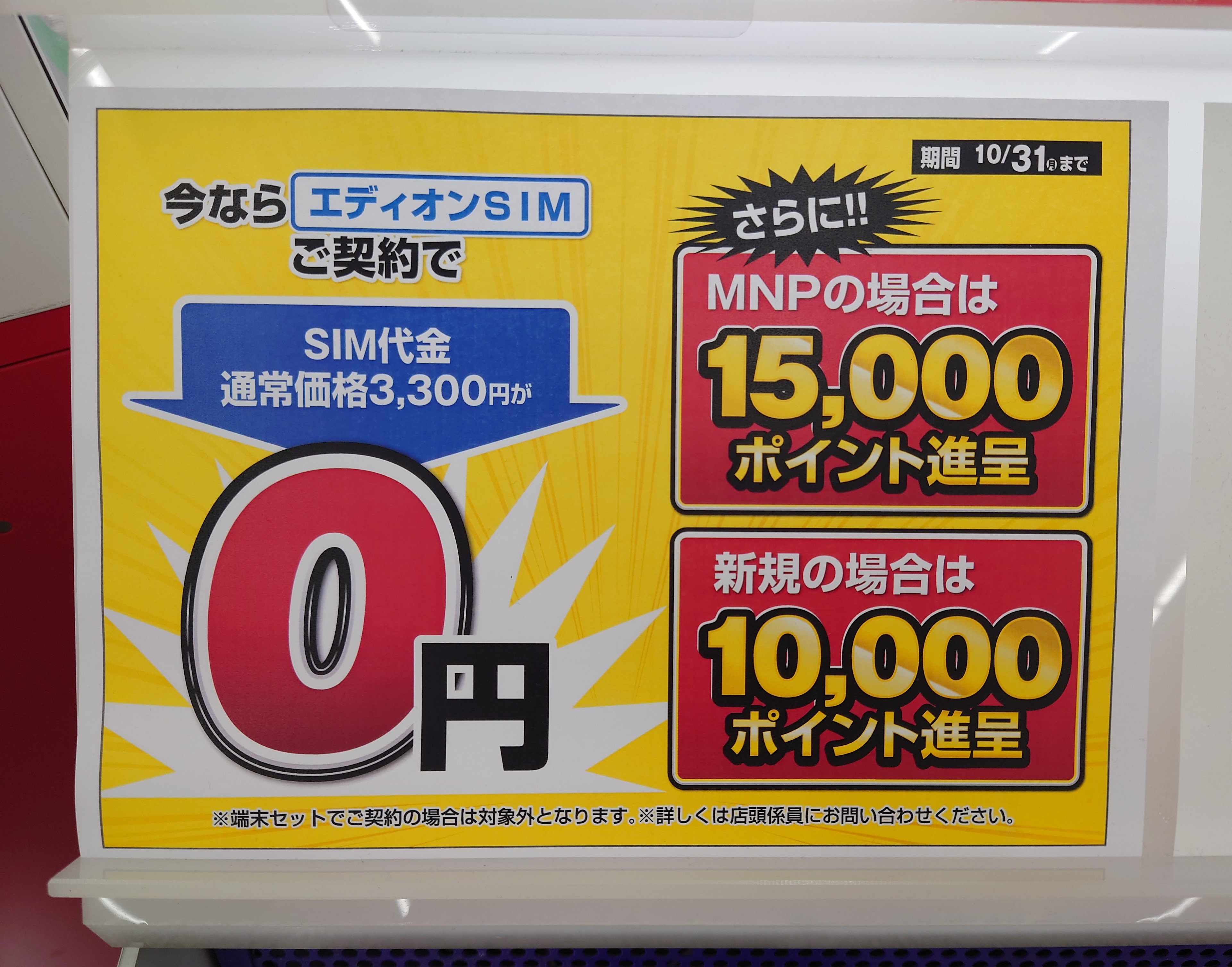 エディオンではビッグローブことエディオンSIMのみMNPで、15,000エディオンポイント還元となっています。10/31(月)まで。