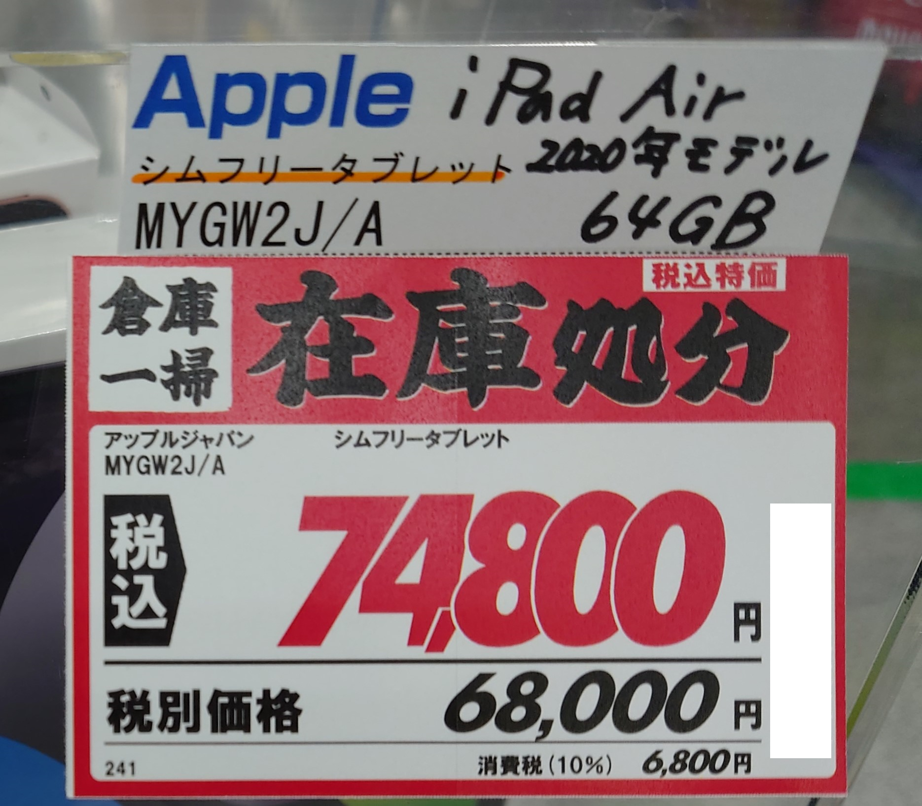 2020年10月発売の「iPad Air(第4世代) 64GB Cellularモデル」が74,800円(税込)。