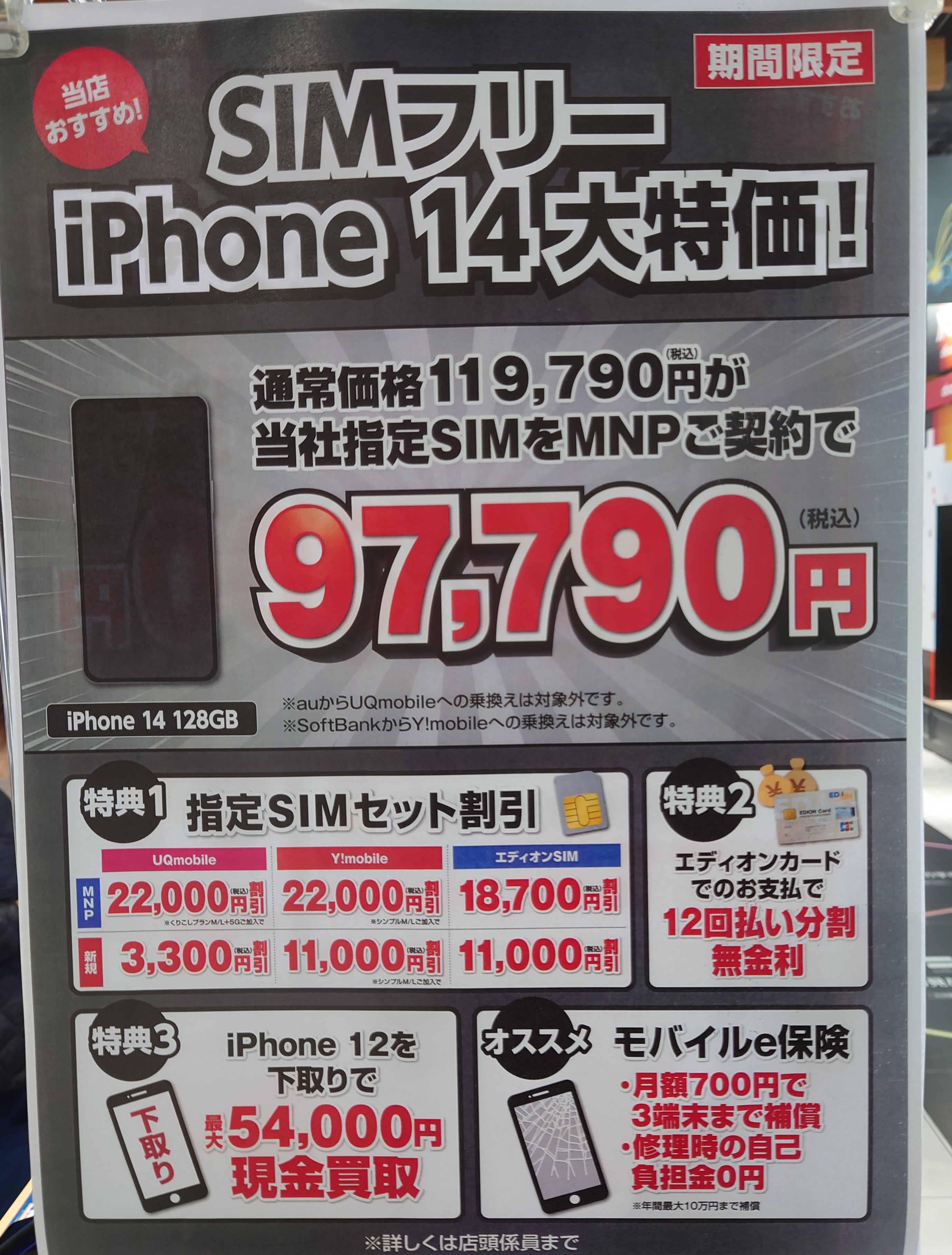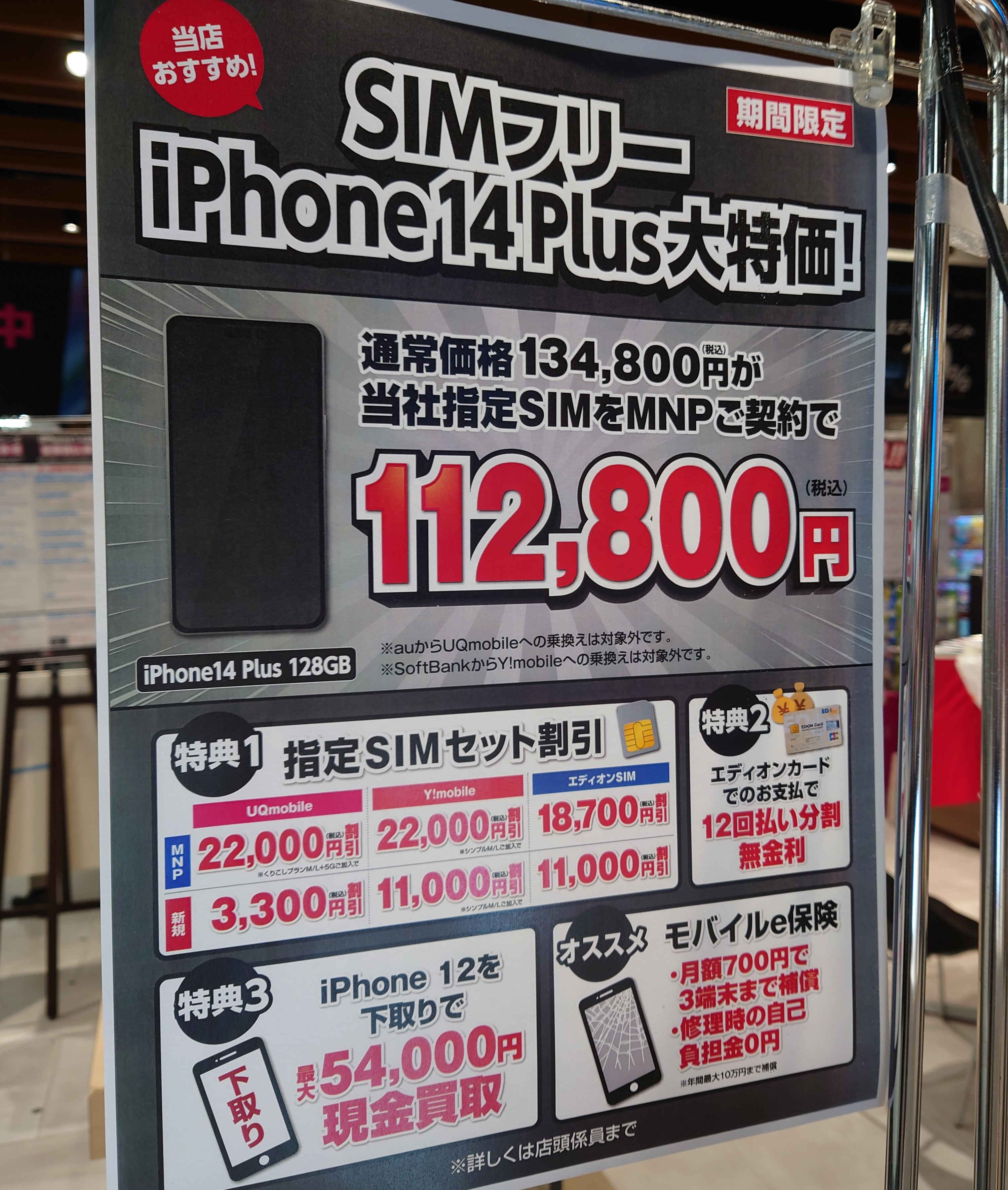 各種SIMフリーiPhoneは、ビッグローブことエディオンSIMへのMNPで18,700円割引。事務手数料は0円。