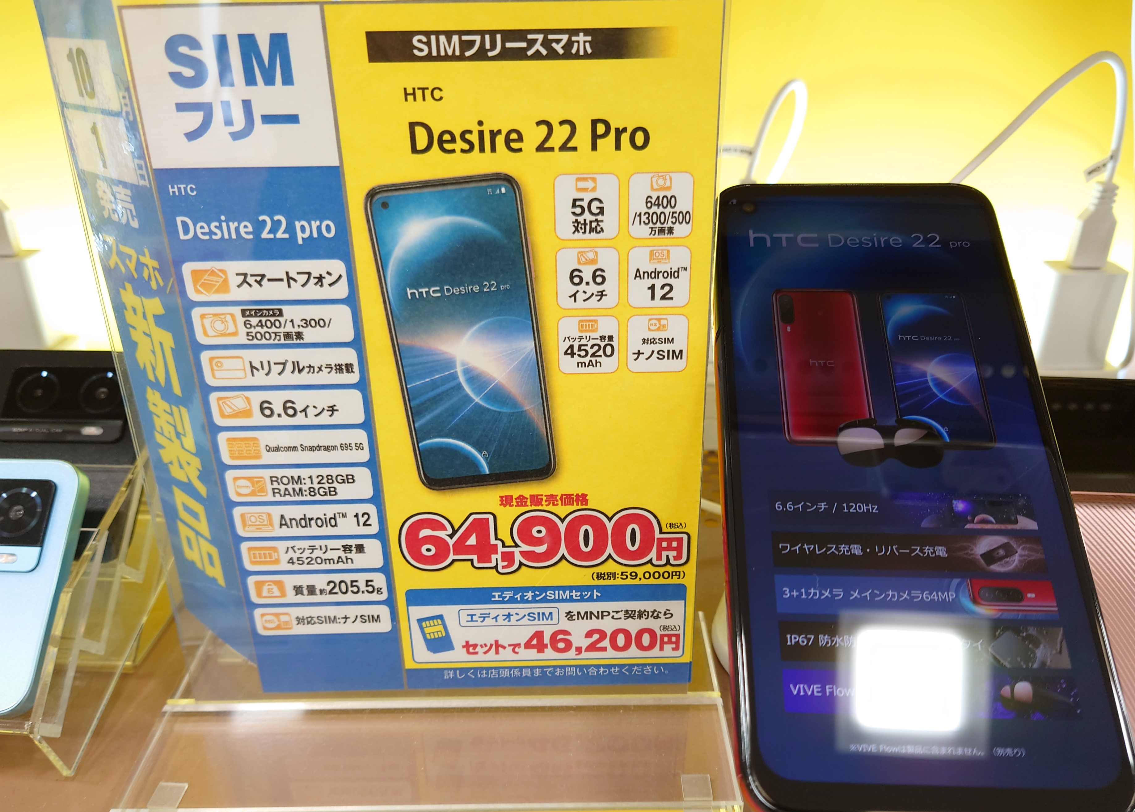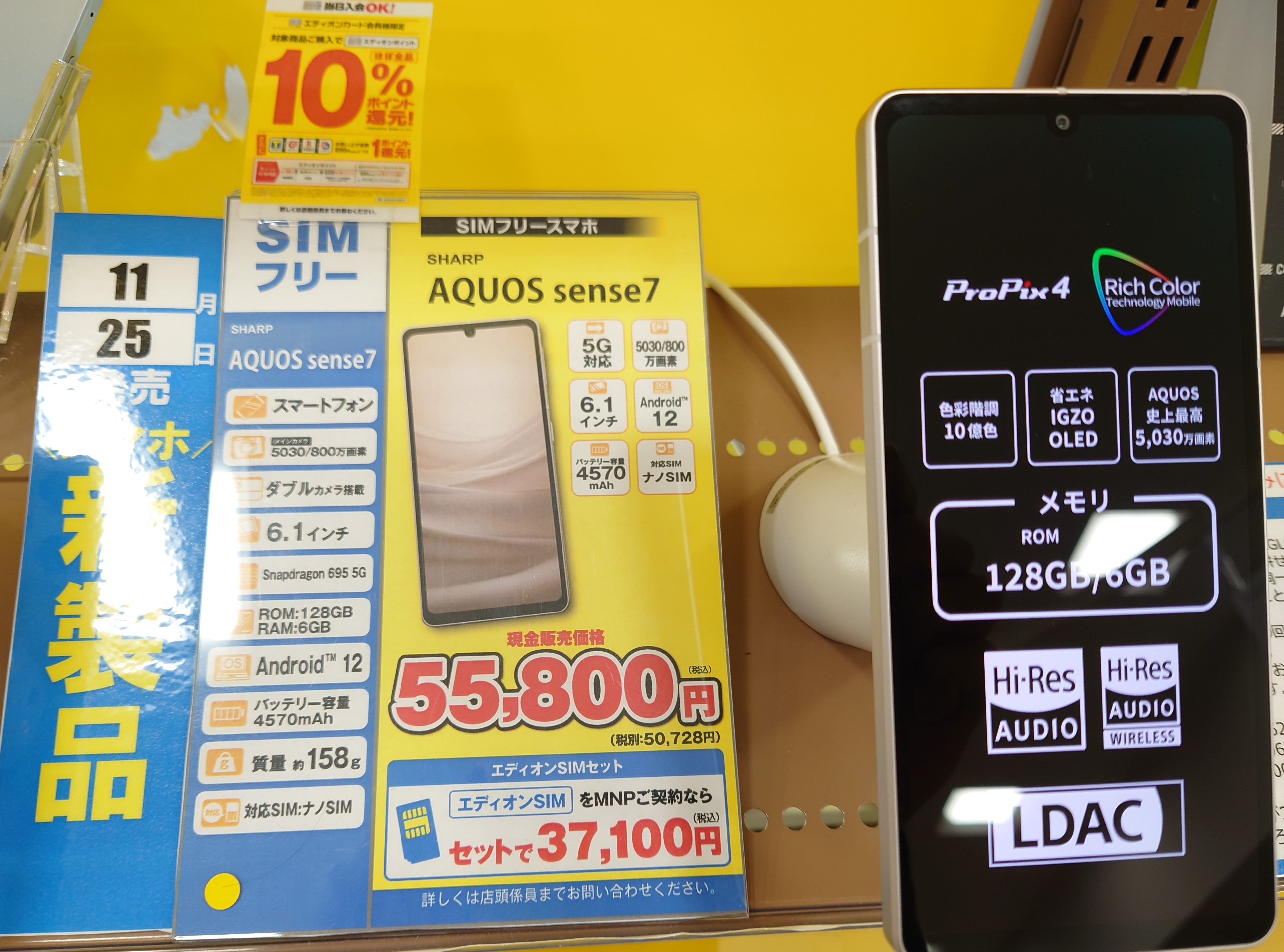 エディオンでは、2022年11月25日発売の「AQUOS sense7(税込55,800円)」がビッグローブことエディオンSIMへのMNPで、一括37,100円(税込)となっています。事務手数料は0円。