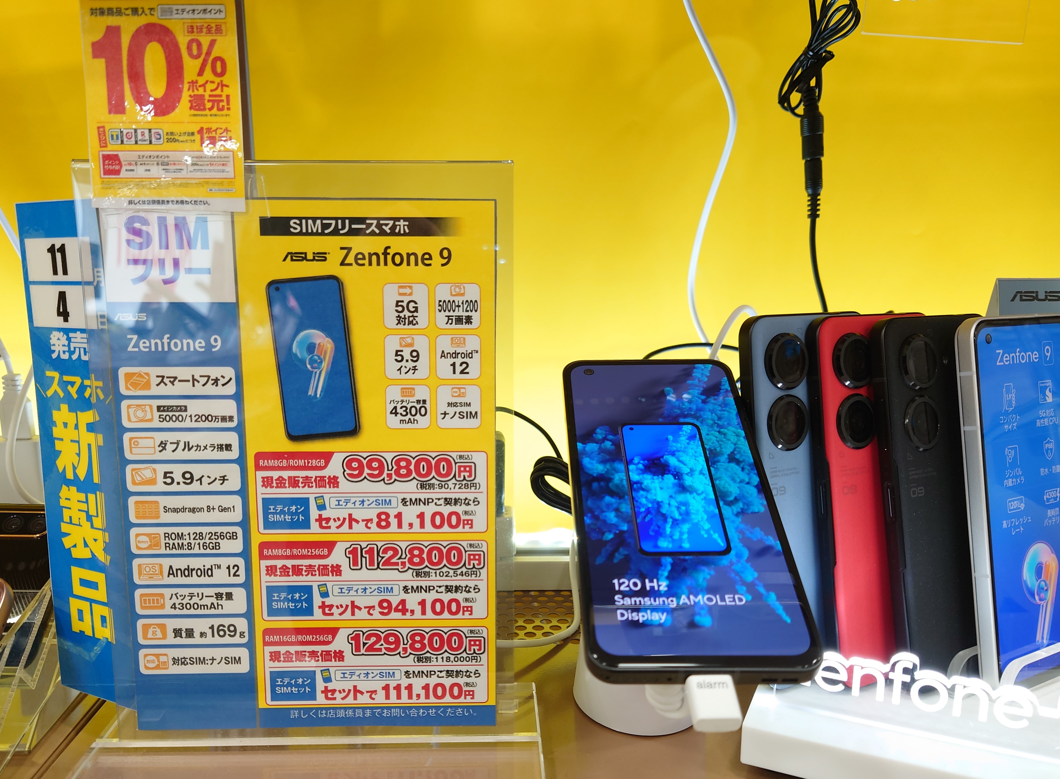 「Zenfone 9 128GB(税込99,800円)」等も10%ポイント還元対象で大変お買い得かと思います。