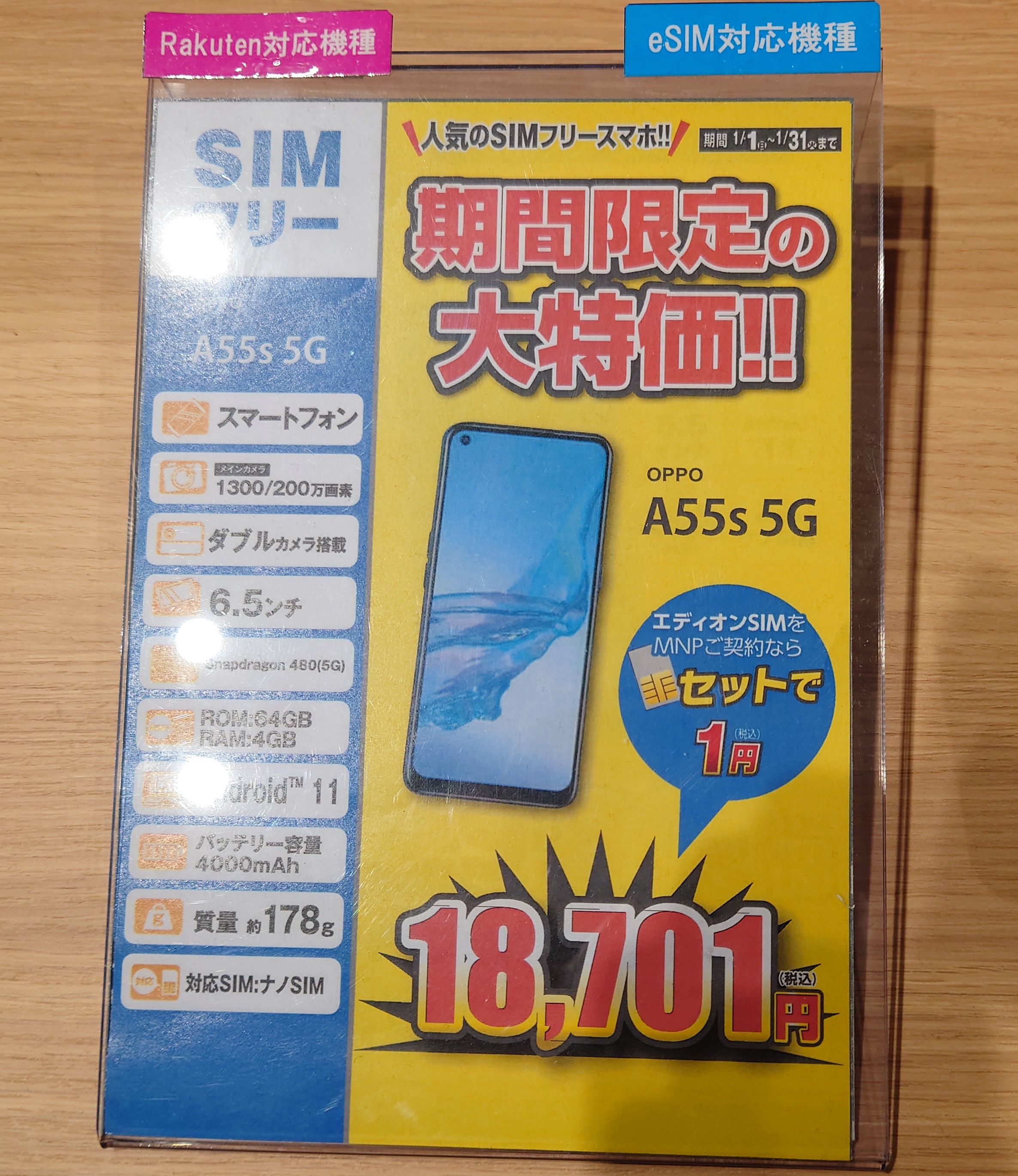 エディオンでは2021年11月26日発売「OPPO A55s 5G」がビッグローブことエディオンSIMへのMNPで、一括1円となっています。事務手数料は無料。1/31(火)まで。