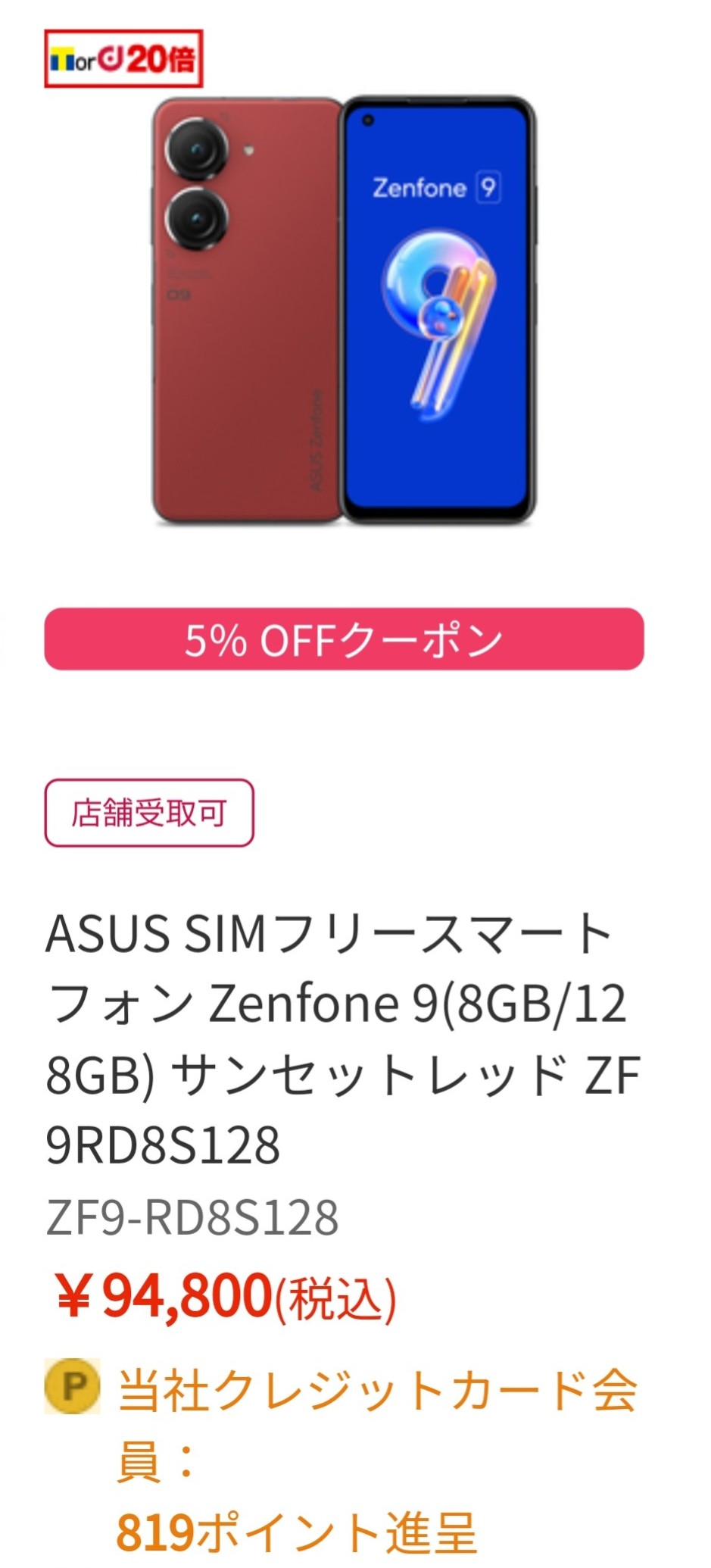 「エディオンネットショップ」では、5,000円OFF中の「Zenfone 9 128GB(税込94,800円)」が、さらに5%OFFクーポン利用で90,060円(税込)となっています。