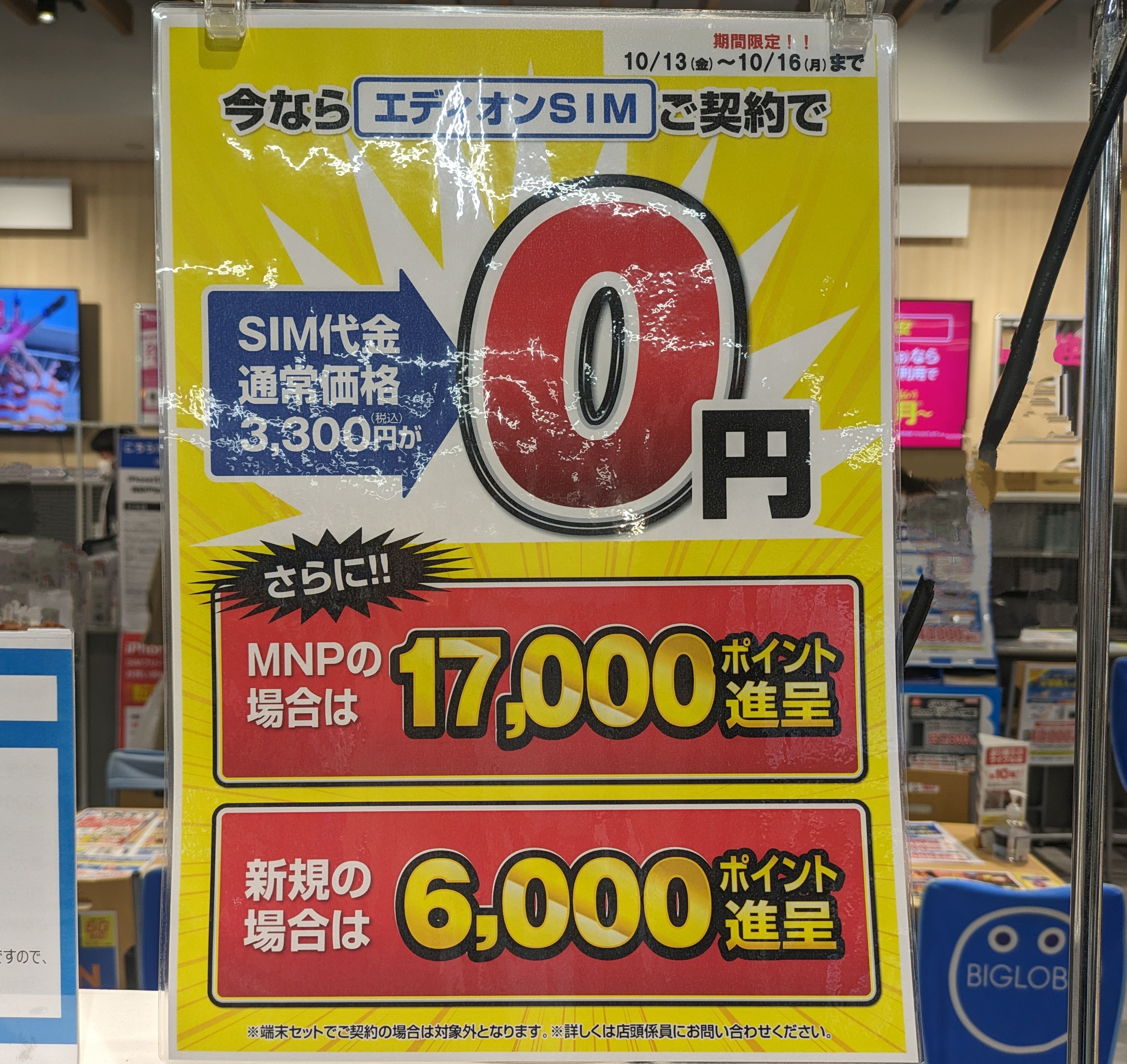 エディオンなんば本店では、ビッグローブことエディオンSIM(ドコモ回線)へのMNPで17,000ポイント還元となっています。10/16(月)まで。