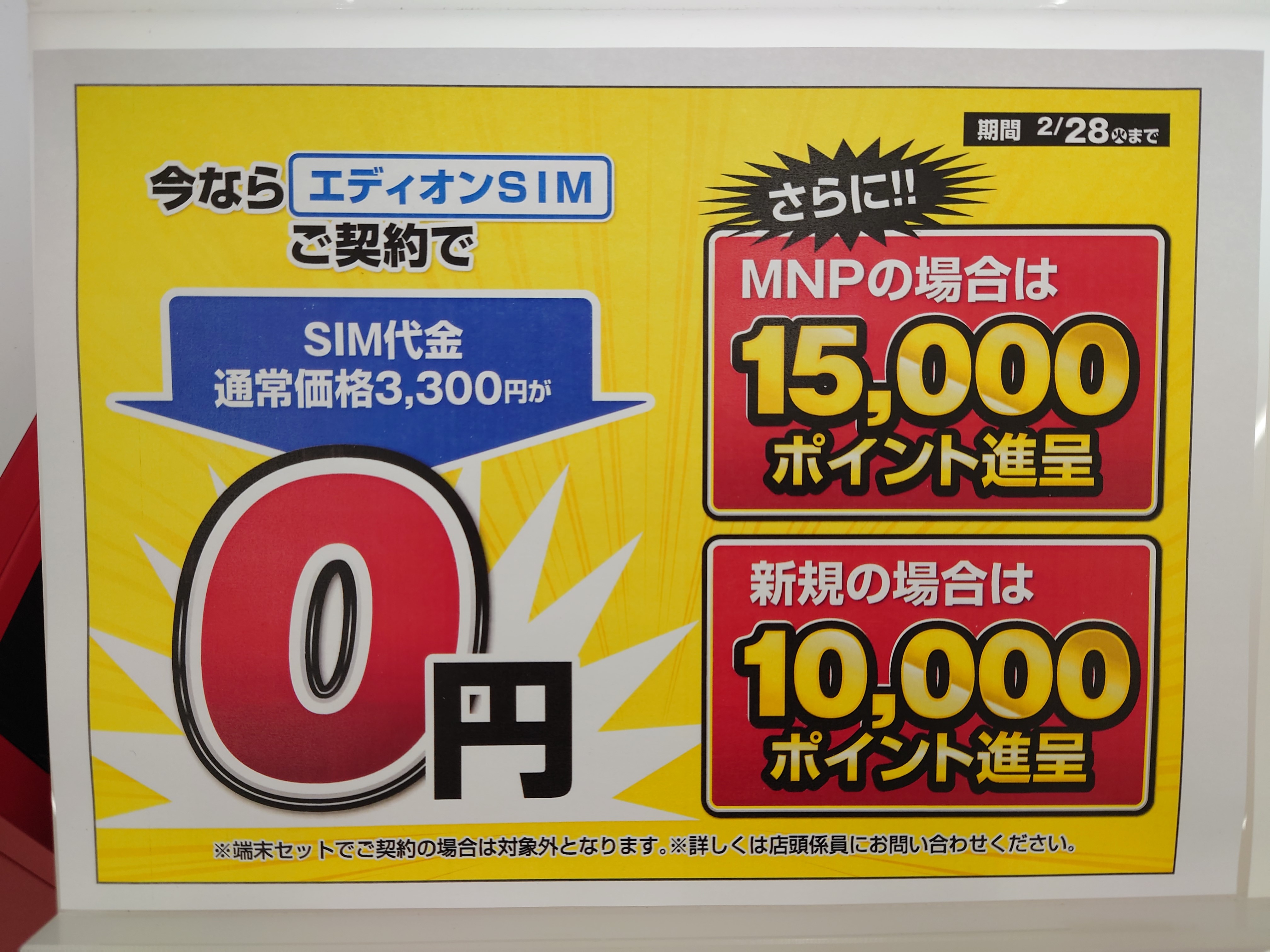 エディオンでは、ビッグローブことエディオンSIMへのMNPで15,000ポイント還元となっています。2/28(火)まで。