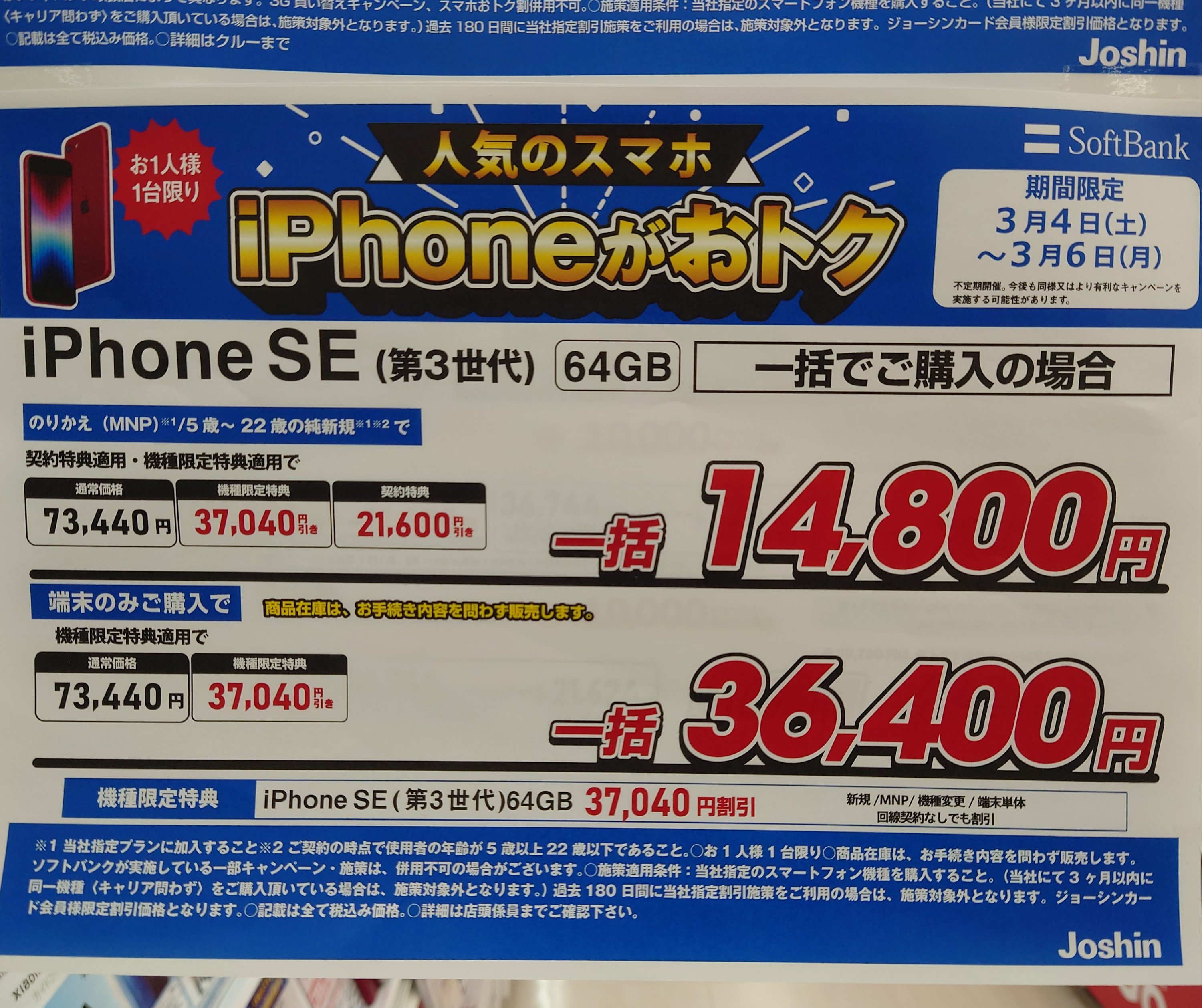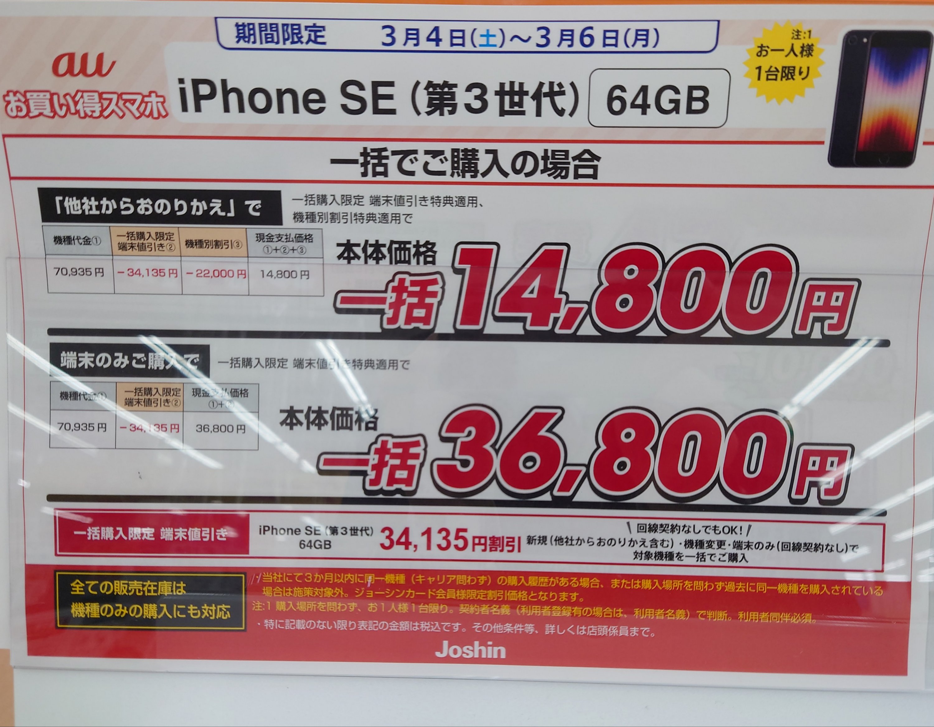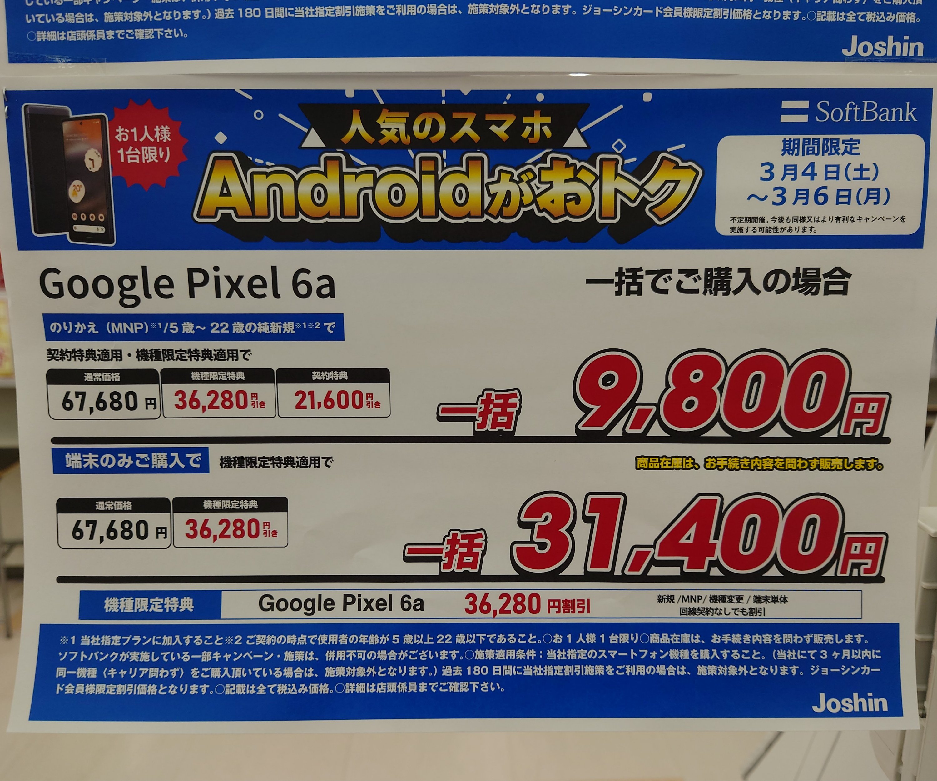 ジョーシンではau「Google Pixel 6a(税込53,270円)」がMNP一括9,800円(税込)となっています。事務手数料は3,300円(税込)。3/6(月)まで。