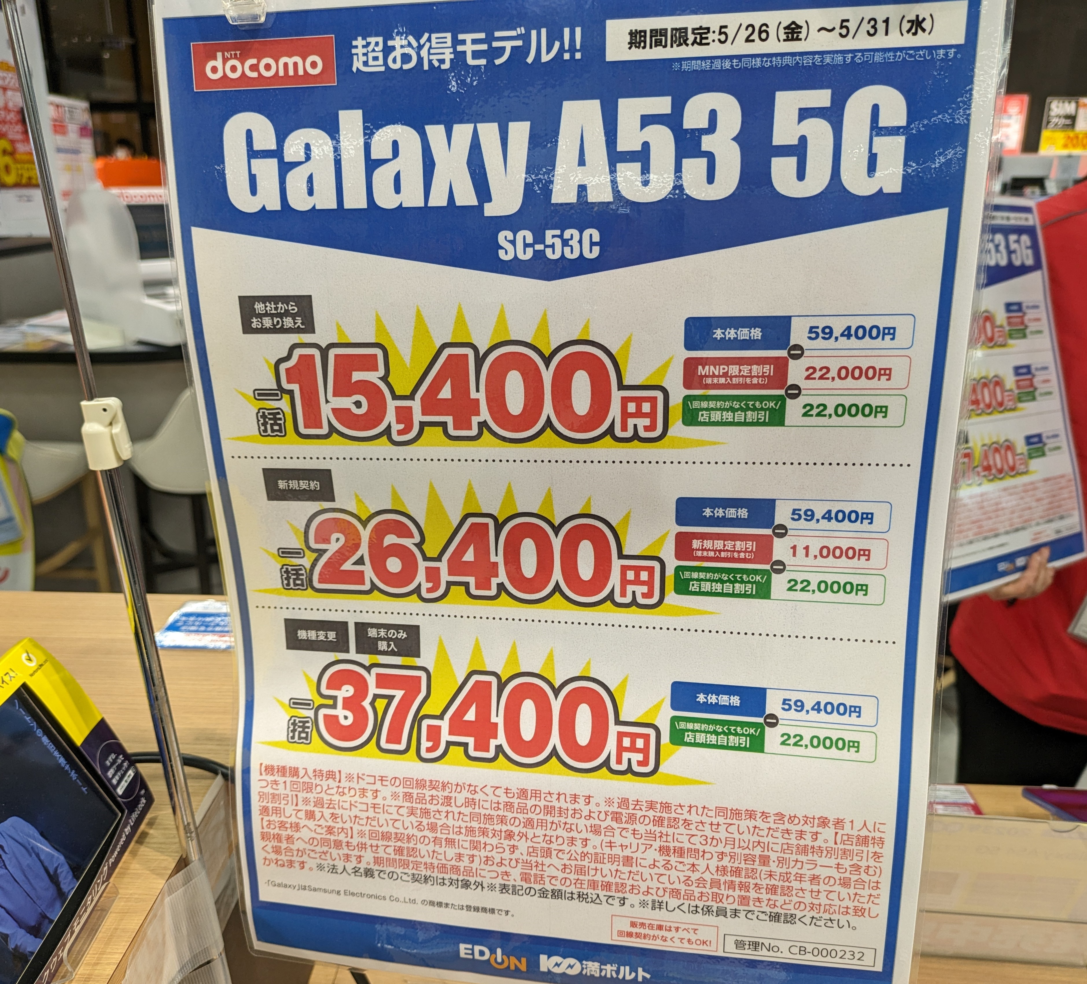 エディオンでは、2022年5月発売のドコモ「Galaxy A53 5G(税込59,400円)」がMNPで一括15,400円(税込)となっています。事務手数料は3,300円(税込)。5/31(水)まで。