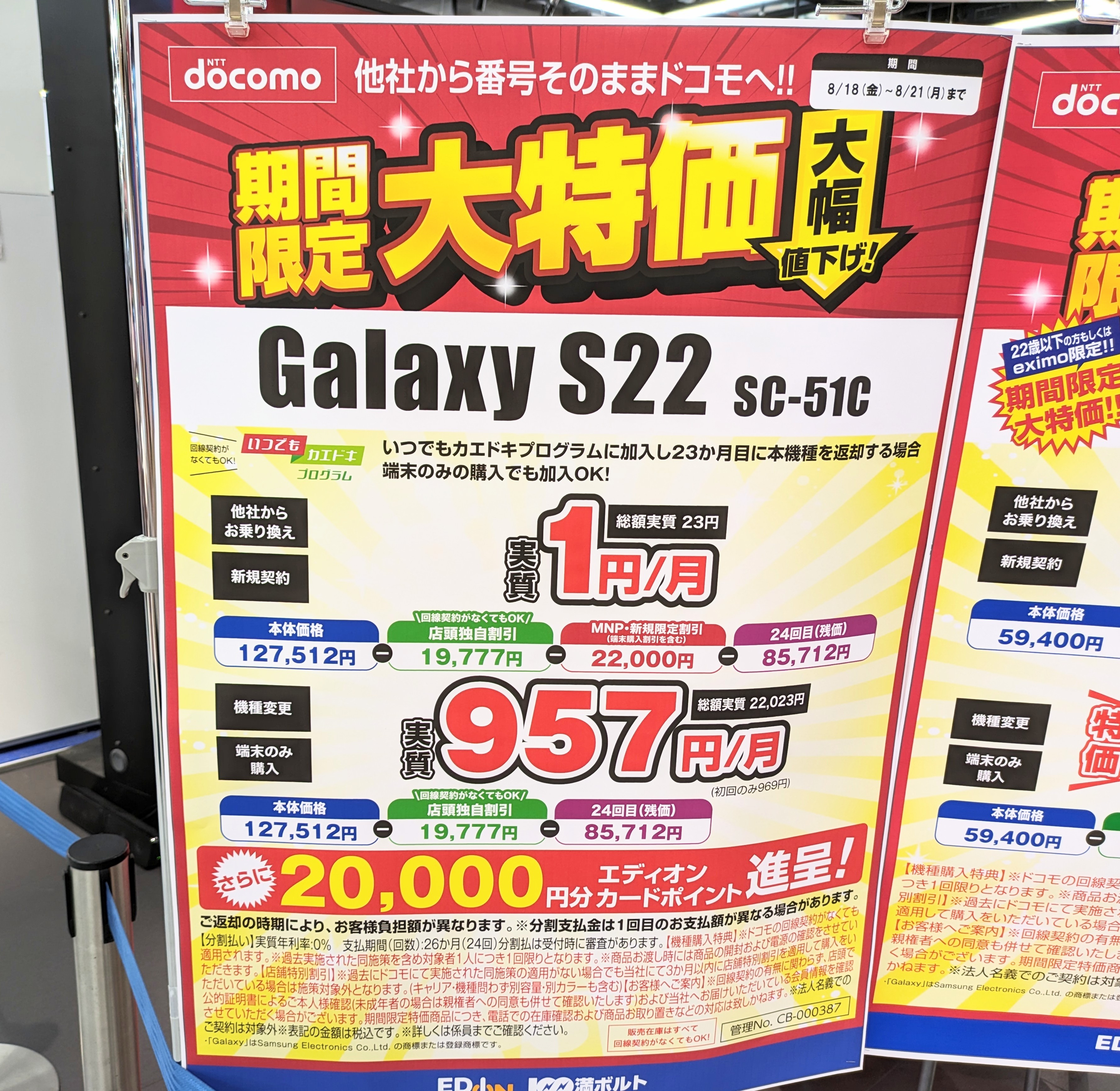 機種購入特典(エディオンは店舗独自割引と表示)の利用はドコモ全店で一人1回まで(店舗問わず、機種問わず)ですので、ご注意下さい。