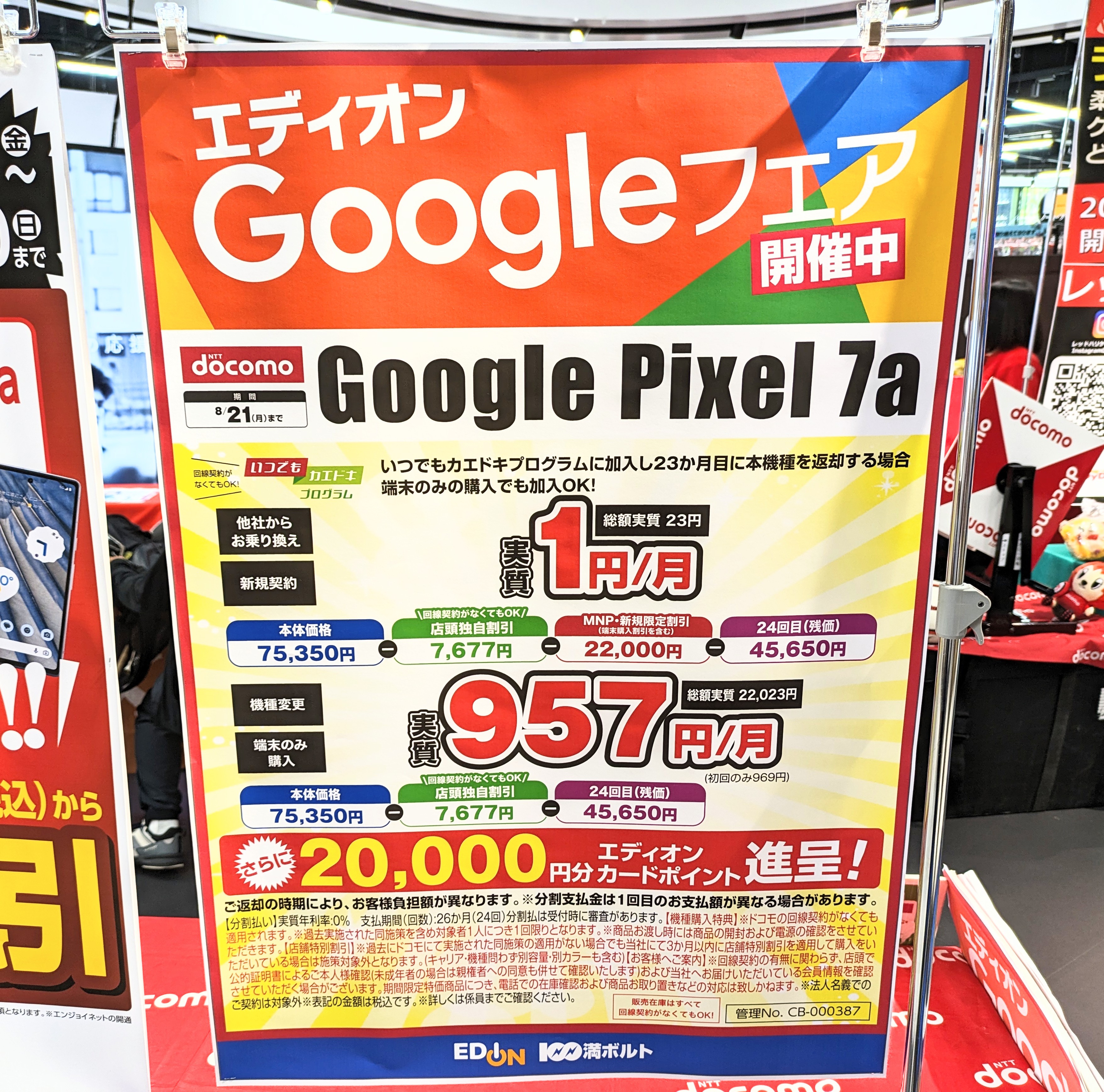 エディオンでは、5/11(木)発売のドコモ「Google Pixel 7a(税込75,350円)」が新規・MNPで29,677円割引となり、分割支払総額45,673円(税込)となっています。事務手数料は3,850円(税込)。8/21(月)まで。