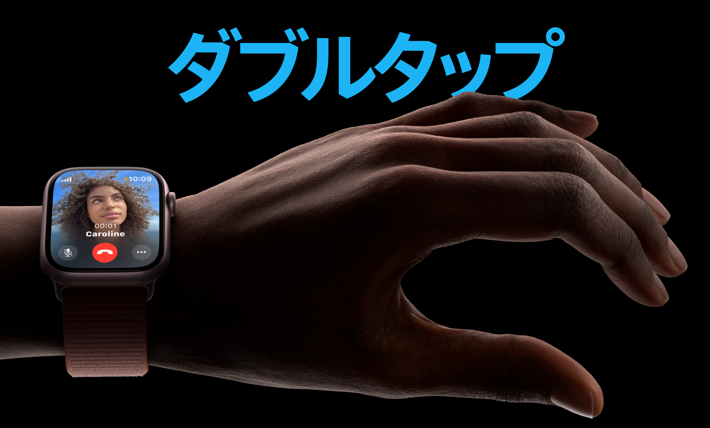 Series 8からの主な進化点は、「S9 SiP」新チップ搭載で処理性能の向上・高速化、ディスプレイ最大輝度が約2倍、Watchを装着している側の手の人差し指と親指でのダブルタップジェスチャー操作機能(画面に触れずに電話応答、音楽再生・停止などが可能に)、アルミニウムに新色ピンク追加など。