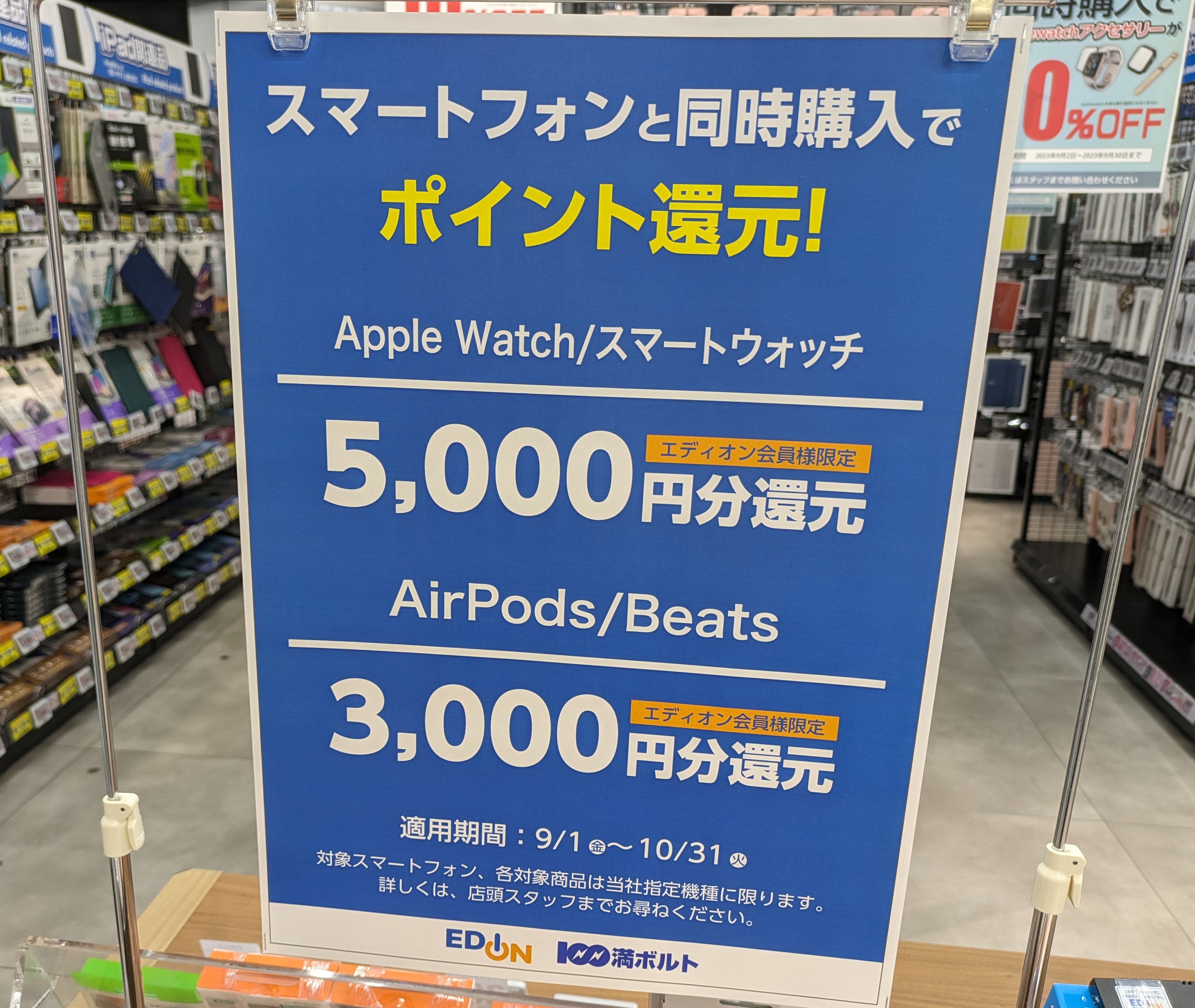 エディオンでは、キャリアスマホとApple Watchを同時購入で、5,000エディオンポイント還元となっています。10/31(火)まで。