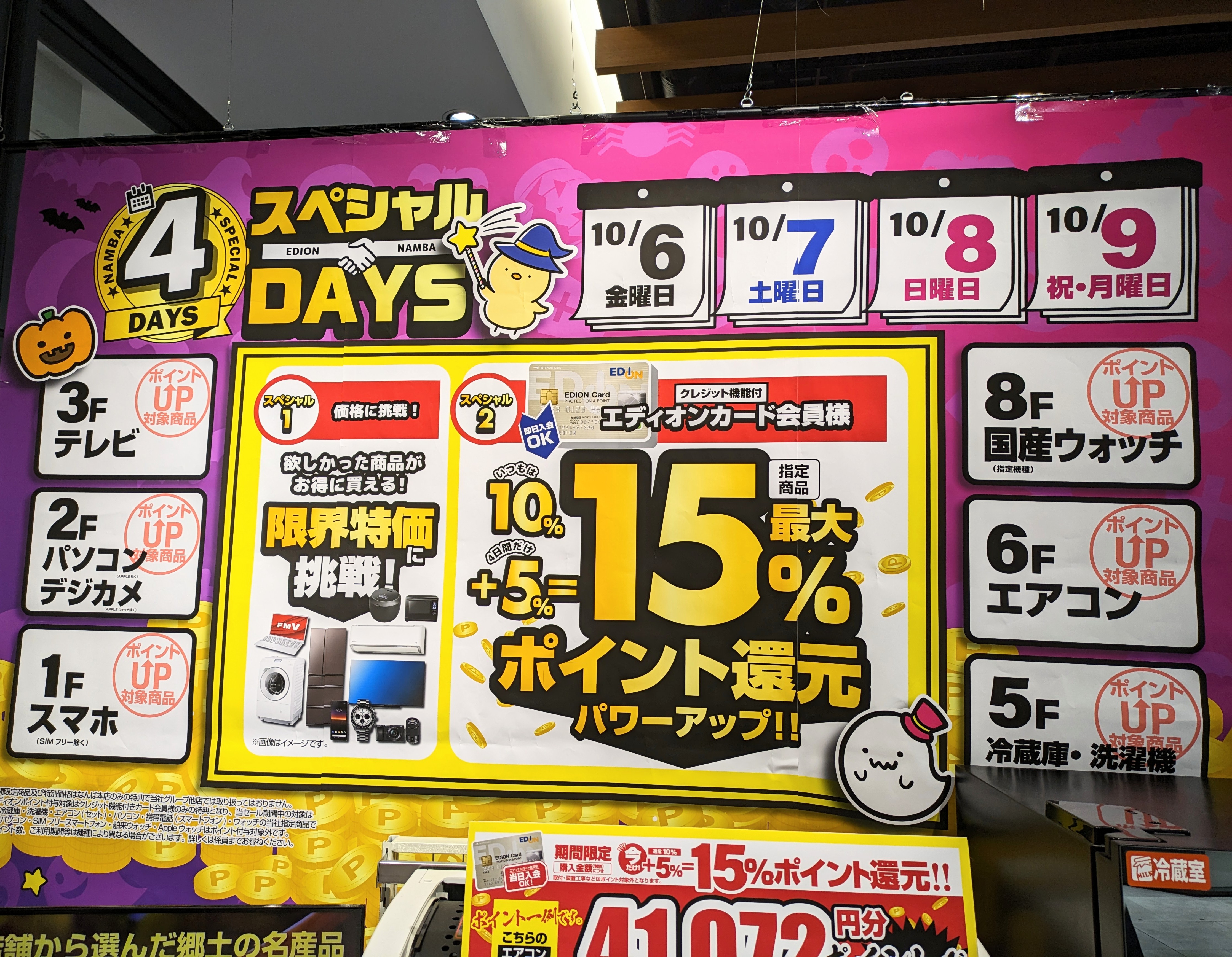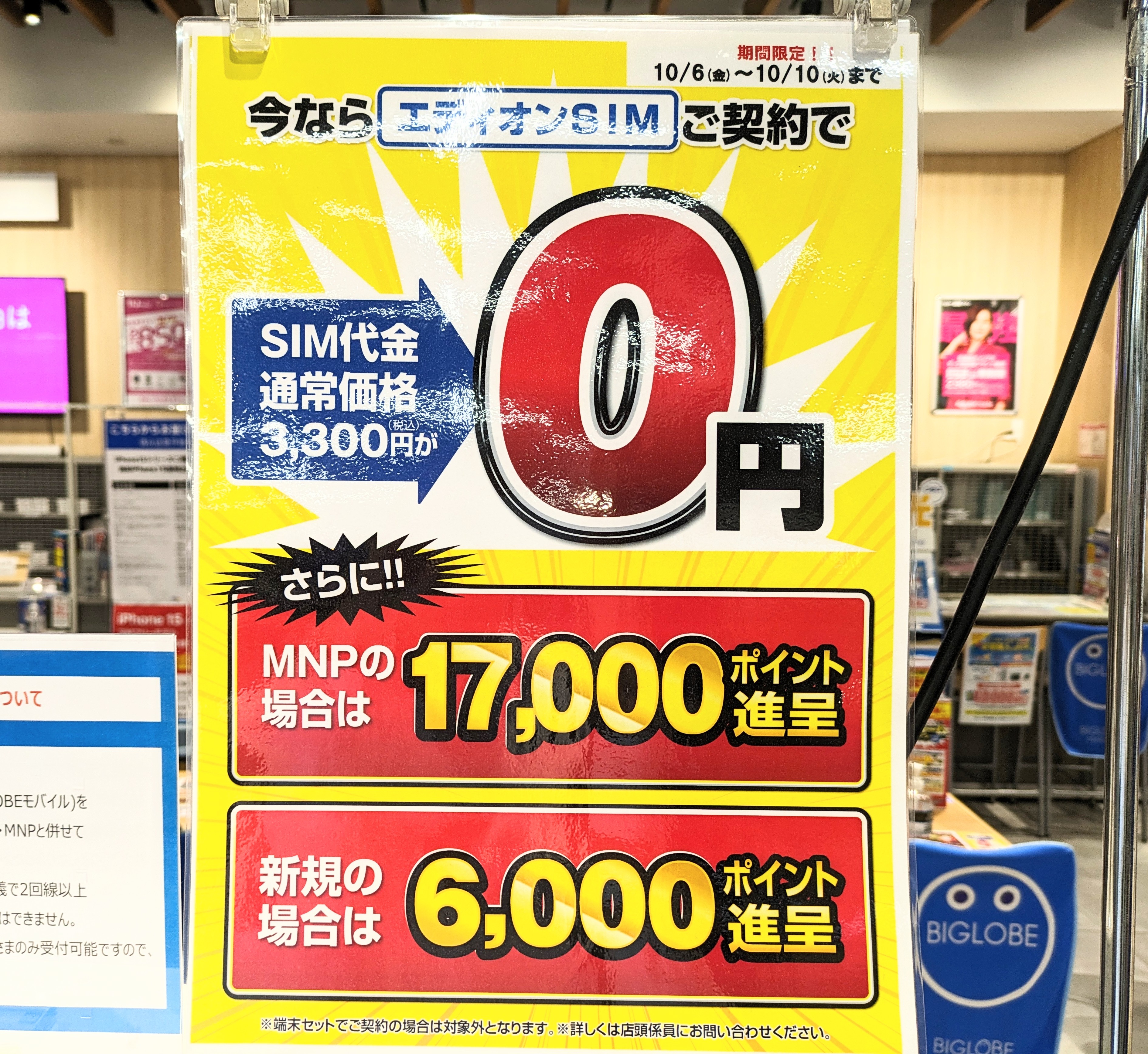エディオンなんば本店では、ビッグローブことエディオンSIM(ドコモ回線)へのMNPで17,000ポイント還元となっています。10/10(火)まで。
