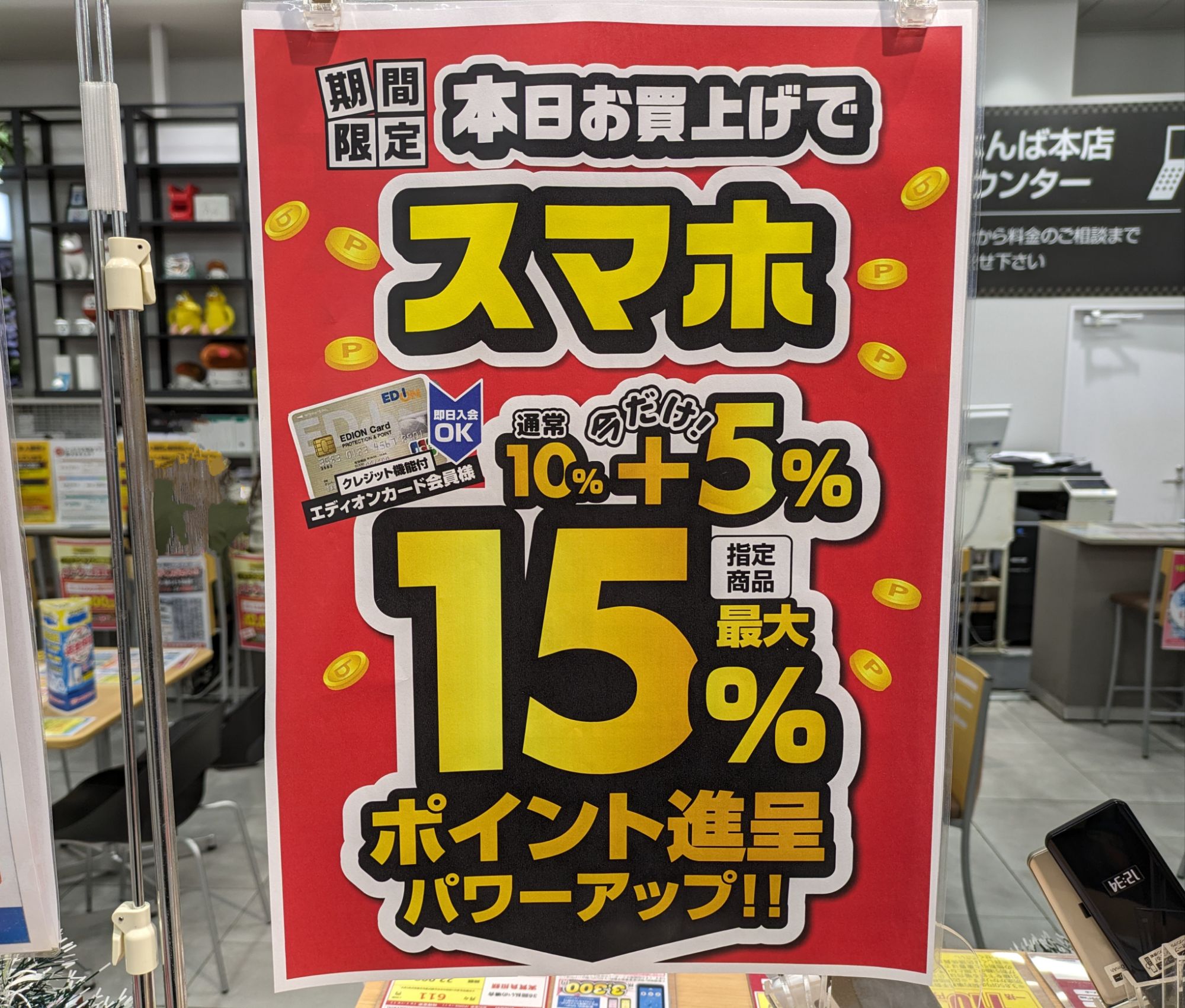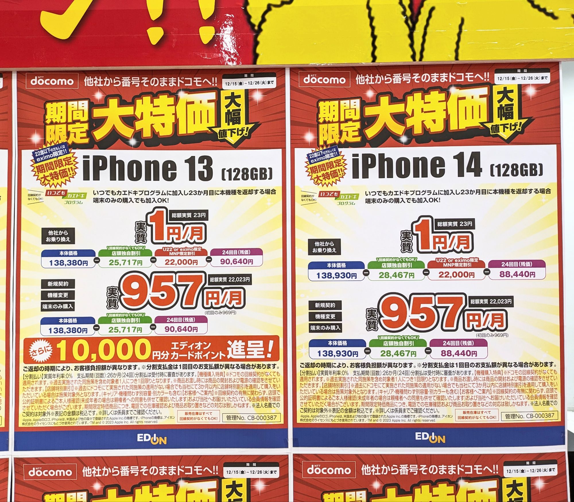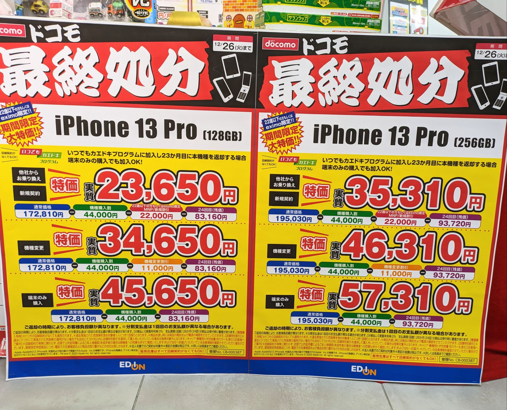 2023年12月16日(土)、エディオンなんば本店ではドコモ「iPhone 13 Pro(税込172,810円)」が、MNP&いつでもカエドキプログラムで端末返却で、実質23,650円(税込)となっています。事務手数料は3,850円(税込)、12/26(火)まで。
