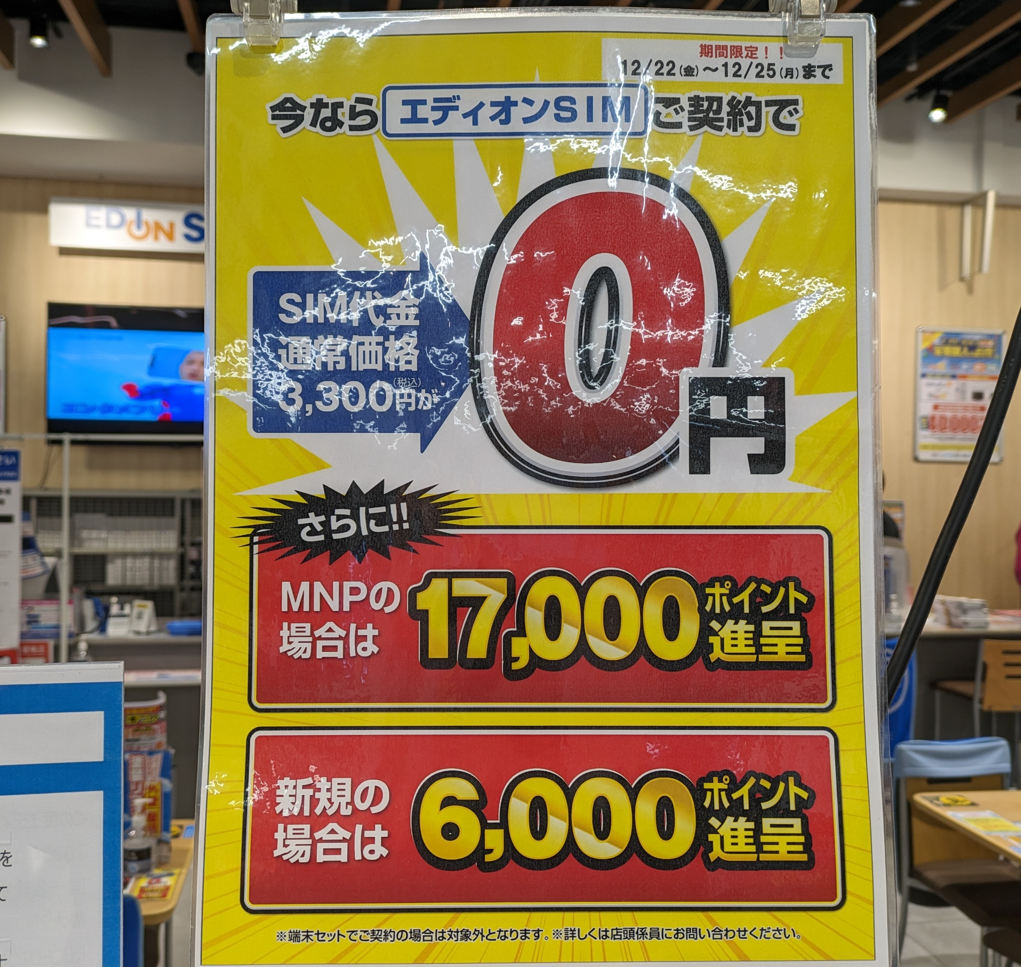 エディオンなんば本店では、ビッグローブことエディオンSIM(ドコモ回線)へのMNPで17,000ポイント還元となっています。