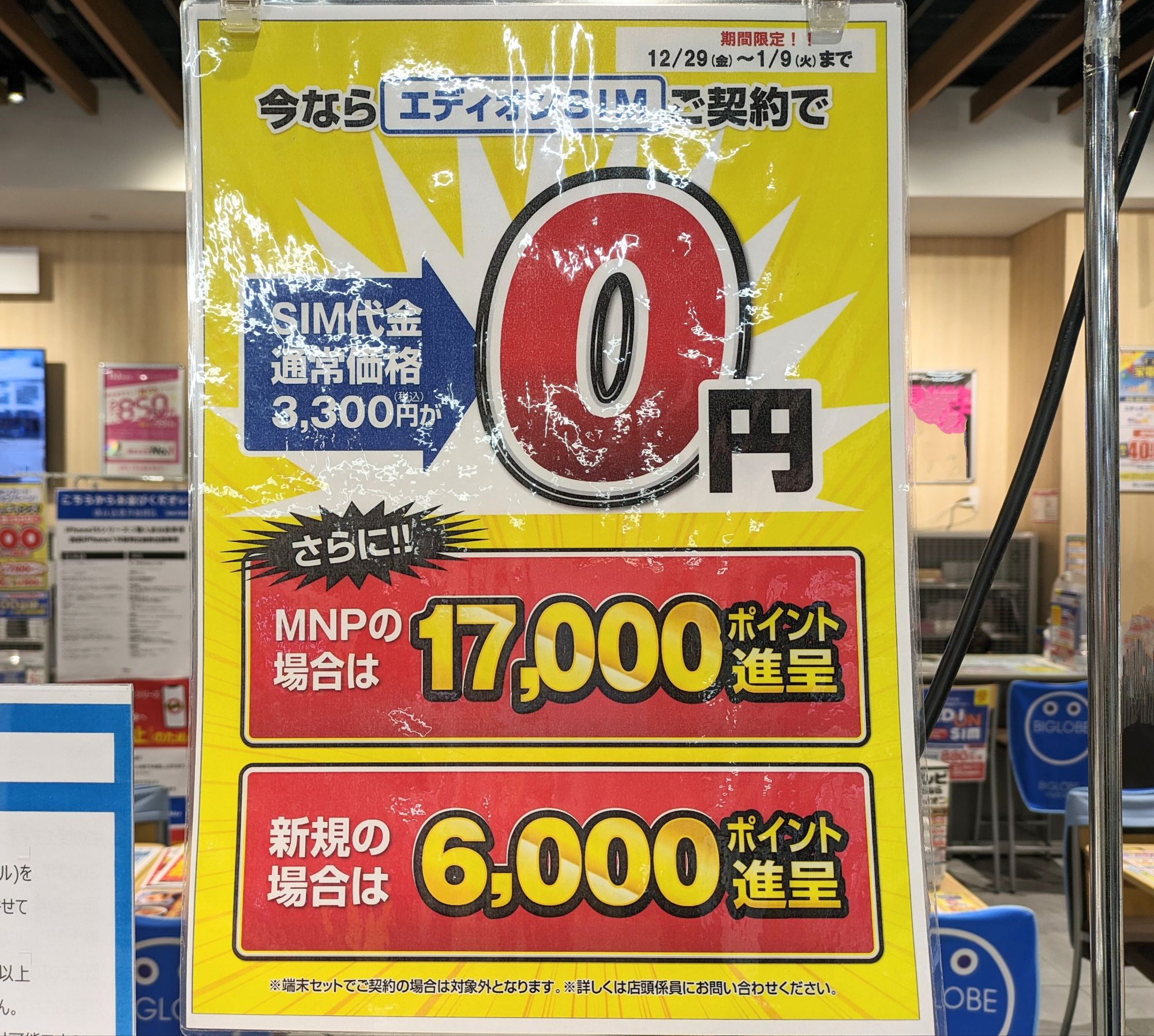 エディオンでは、ビッグローブことエディオンSIM(ドコモ回線)へのMNPで17,000ポイント還元となっています。