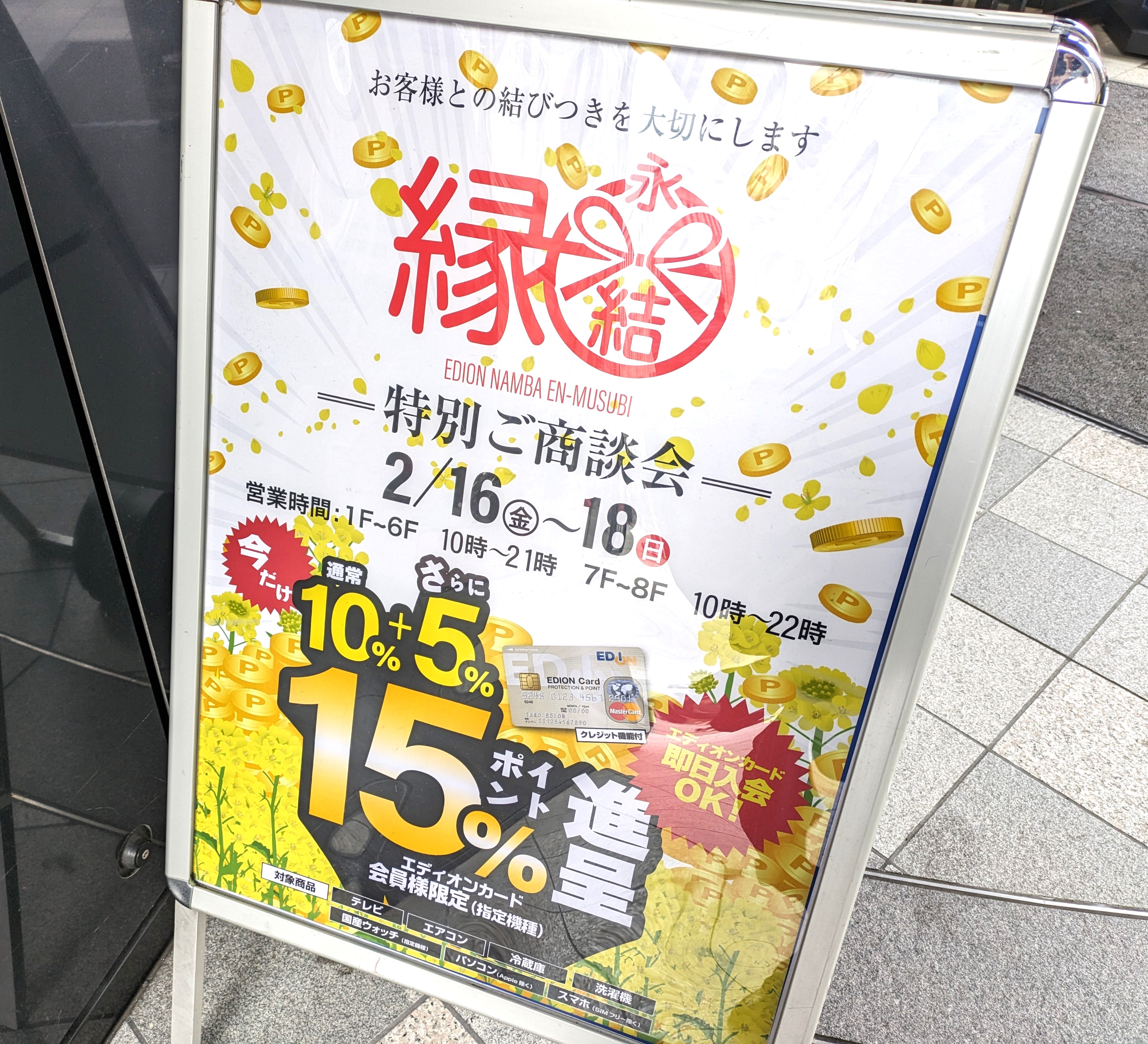 なんば本店では、2/18(日)まではエディオンカード会員限定で15%ポイント還元(税抜価格に対して)ですの、機種変更で約7,984円ポイント還元です。