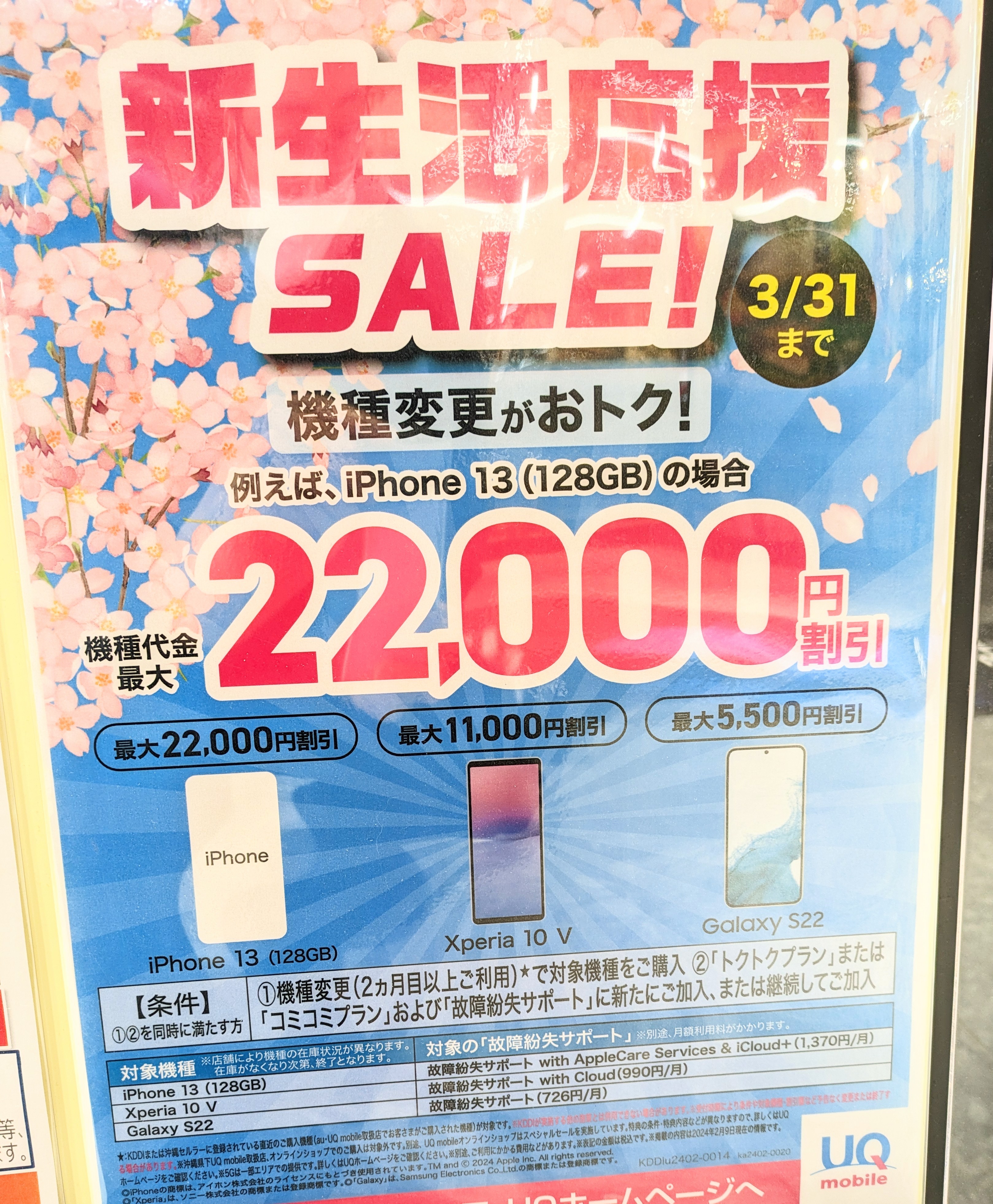 エディオンでは、2023年7月発売のUQモバイル「Xperia 10 V(税込69,550円)」が、機種変更で11,000円割引となり、総額58,550円(税込)となっています。